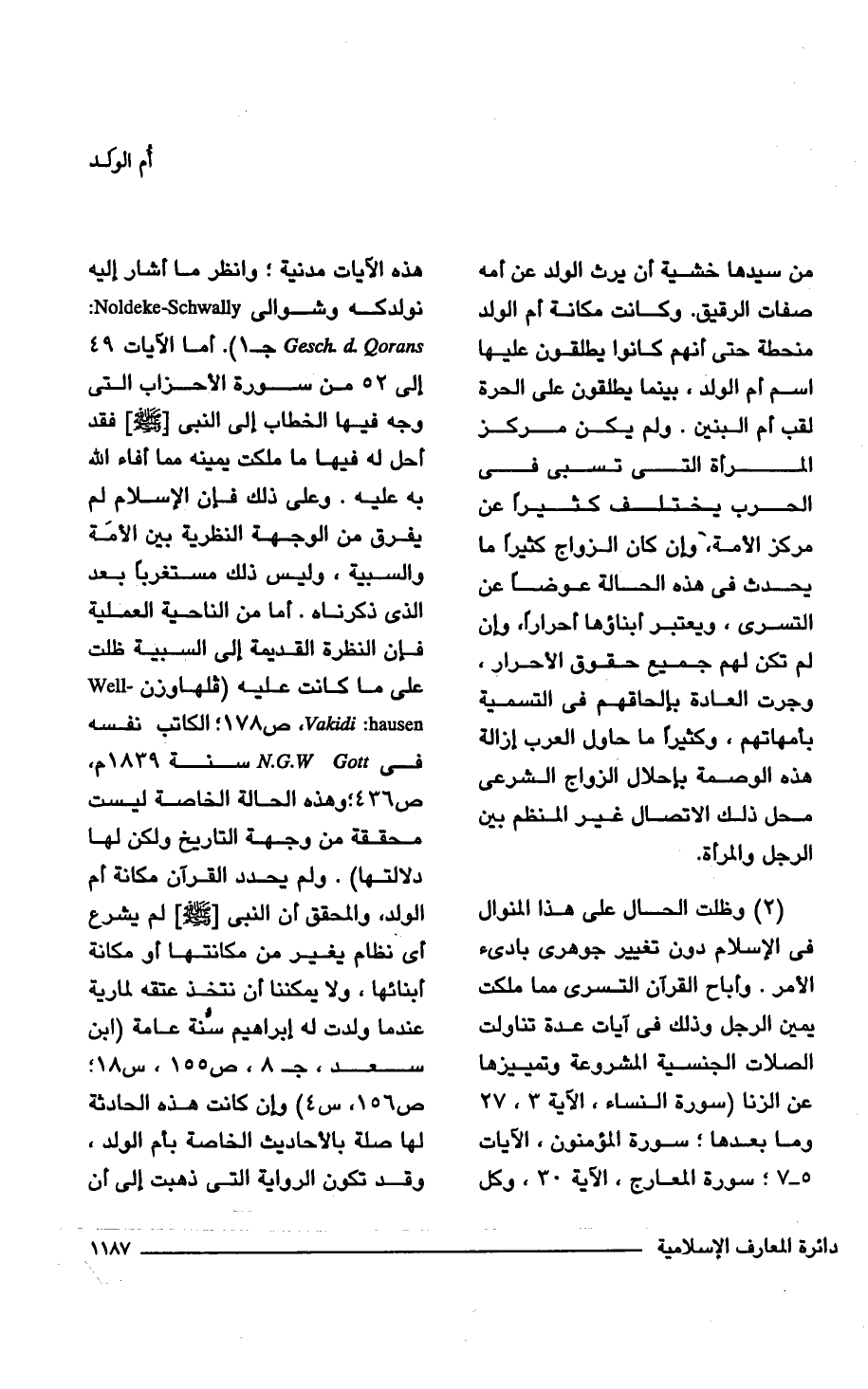 (2) وظلت الحال على هذا المنوال فى الإسلام دون تغيير جوهرى بادئ الأمر. وأباح القرآن التسرى مما ملكت يمين الرجل وذلك فى آيات عدة تناولت الصلات الجنسية المشروعة وتمييزها عن الزنا (سورة النساء، الآية 3، 27 وما بعدها؛ سورة المؤمنون، الآيات 5 - 7؛ سورة المعارج، الآية 30، وكل هذه الآيات مدنية؛ وانظر ما أشار إليه نولدكه وشوالى Noldeke-Schwally: Gesch- d- Qorans جـ 1). أما الآيات 49 إلى 52 من سورة الأحزاب التى وجه فيها الخطاب إلى النبى [- صلى الله عليه وسلم -] فقد أحل له فيها ما ملكت يمينه مما أفاء الله به عليه. وعلى ذلك فإن الإسلام لم يفرق من الوجهة النظرية بين الأمَة والسبية، وليس ذلك مستغرباً بعد الذى ذكرناه. أما من الناحية العملية فإن النظرة القديمة إلى السبية ظلت على ما كانت عليه (فلهاوزن - Well hausen: Vakidi، ص 178؛ الكاتب نفسه فى N.G.W Gott سنة 1839 م، ص 436؛ وهذه الحالة الخاصة ليست محققة من وجهة التاريخ ولكن لها دلالتها). ولم يحدد القرآن مكانة أم الولد، والمحقق أن النبى [- صلى الله عليه وسلم -] لم يشرع أى نظام يغير من مكانتها، أو مكانة أبنائها، ولا يمكننا أن نتخذ عتقه لمارية عندما ولدت له إبراهيم سُنَّة عامة (ابن سعد، جـ 8، ص 155، س 18؛ ص 156، س 4) وإن كانت هذه الحادثة لها صلة بالأحاديث الخاصة بأم الولد، وقد تكون الرواية التى ذهبت إلى أن
