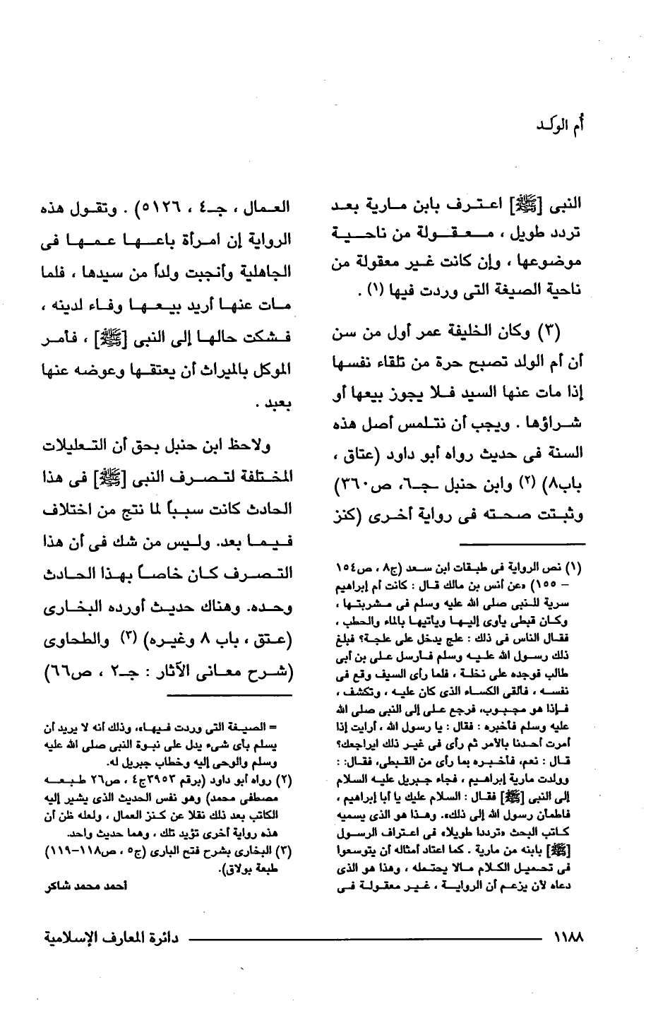 (¬1) نص الرواية فى طبقات ابن سعد (ج 8، ص 154 - 155) "عن أنس بن مالك قال: كانت أم إبراهيم سرية للنبى - صلى الله عليه وسلم - فى مشربتها، وكان قبطى يأوى إليها ويأتيها بالماء والحطب، فقال الناس فى ذلك: علج يدخل على علجة؟ فبلغ ذلك رسول - صلى الله عليه وسلم - فأرسل على بن أبى طالب فوجده على نخلة. فلما رأى السيف وقع فى نفسه، فألقى الكساء الذى كان عليه، وتكشف، فإذا هو مجبوب، فرجع على إلى النبى - صلى الله عليه وسلم - فأخبره: فقال: يا رسول الله، أرايت إذا أمرت أحدنا بالأمر ثم رأى فى غير ذلك أيراجعك؟ قال: نعم، فأخبره بما رأى من القبطى، فقال: وولدت مارية إبراهيم، فجاء جبريل عليه السلام إلى النبى - صلى الله عليه وسلم - فقال: السلام عليك يا أبا إبراهيم، فاطمأن رسول الله إلى ذلك". وهذا هو الذى يسميه كاتب البحث "ترددا طويلا" فى اعتراف الرسول - صلى الله عليه وسلم - بابنه من مارية. كما اعتاد أمثاله أن يتوسعوا فى تحميل الكلام مالا يحتمله، ومذا هو الذى دعاه لأن يزعم أن الرواية، غير معقولة فى الصيغة التى وردت فيها"، وذلك أنه لا يريد أن يسلم بأى شئ يدل على نبوة النبى - صلى الله عليه وسلم - والوحى إليه وخطاب جبريل له.