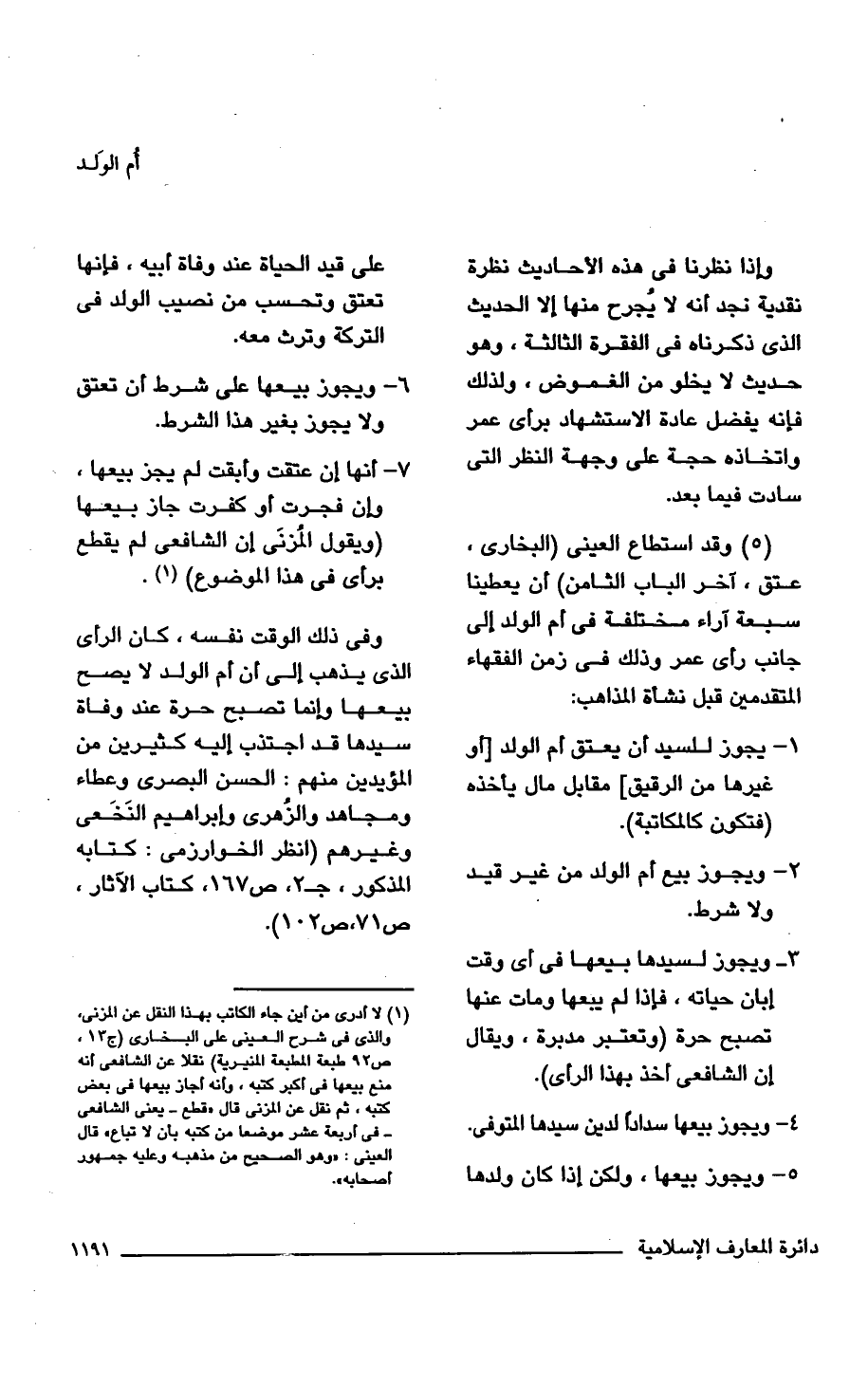(5) وقد استطاع العينى (البخارى، عتق، آخر الباب الثامن) أن يعطينا سبعة آراء مختلفة فى أم الولد إلى جانب رأى عمر وذلك فى زمن الفقهاء المتقدمين قبل نشأة المذاهب: