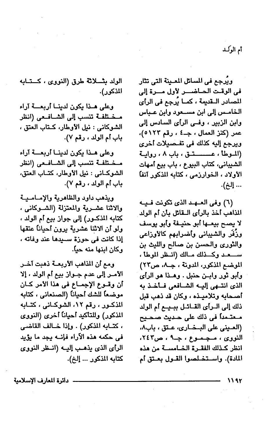 ومع أن المذاهب الأربعة ذهبت آخر الأمر إلى عدم جواز بيع أم الولد، إلا أن وقوع الإجماع فى هذا الأمر كان موضعاً للشك أحياناً (الصنعانى، كتابه المذكور، رقم 12، الشوكانى، كتابه المذكور) وللتأكيد أحياناً أخرى (النووى، كتابه المذكور). وإذا خالف القاضى فى حكمه هذه الآراء فإنه يجد ما يؤيد الرأى الذى يذهب إليه (انظر النووى كتابه المذكور ... إلخ).