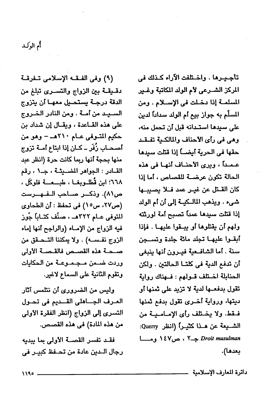 تأجيرها. واختلفت الآراء كذلك فى المركز الشرعى لأم الولد المكاتبة وغير المسلمة إذا دخلت فى الإسلام. ومن المسلّم به جواز بيع أم الولد سداداً لدين على سيدها استدانه قبل أن تحمل منه، وهى فى رأى الأحناف والمالكية تفقد حقها فى الحرية أيضاً إذا قتلت سيدها عمداً، ويرى الأحناف أنها فى هذه الحالة تكون عرضة للقصاص، أما إذا كان القتل عن غير عمد فلا يصيبها شئ. ويذهب المالكية إلى أن أم الولد إذا قتلت سيدها عمداً تصبح أمة لورثته ولهم أن يقتلوها أو يبقوا عليها. فإذا أبقوا عليها تجلد مائة جلدة وتسجن سنة. أما الشافعية فيرون أنها ينبغى أن تدفع الدية فى كلتا الحالتين. ولكن الحنابلة اختلف قولهم: فهناك رواية تقول بدفعها لدية لا تزيد على ثمنها أو ديتها، ورواية أخرى تقول بدفع ثمنها فقط. ولا يختلف رأى الإمامية من الشيعة عن هذا كثيراً (انظر Querry: Droit musulman جـ 2، ص 147 وما بعدها).