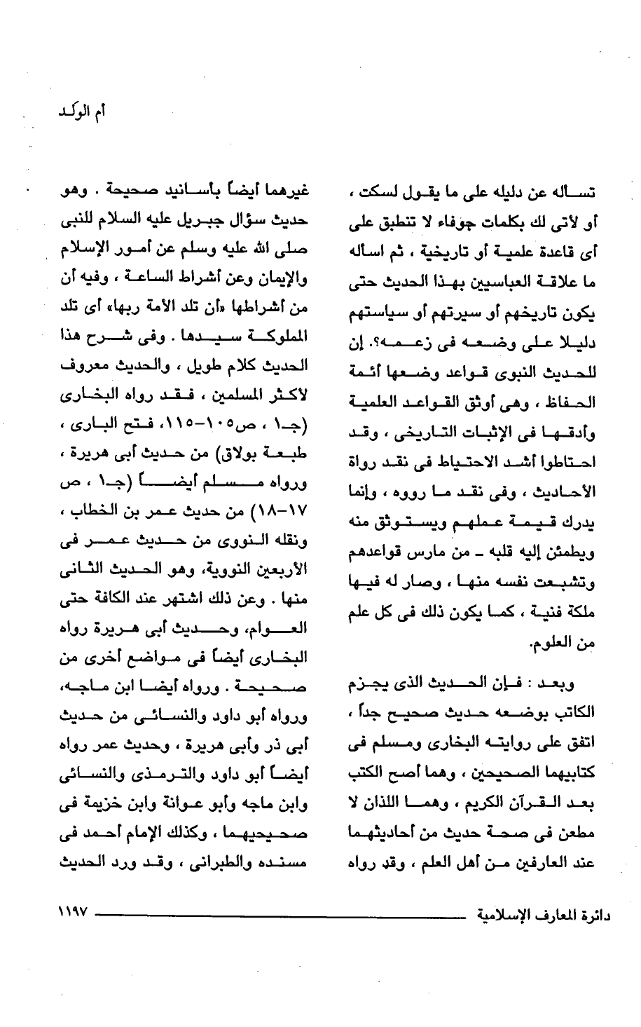 وبعد: فإن الحديث الذى يجزم الكاتب بوضعه حديث صحيح جداً، اتفق على روايته البخارى ومسلم فى كتابيهما الصحيحين، وهما أصح الكتب بعد القرآن الكريم، وهما اللذان لا مطعن فى صحة حديث من أحاديثهما عند العارفين من أهل العلم، وقد رواه غيرهما أيضاً بأسانيد صحيحة. وهو حديث سؤال جبريل عليه السلام للنبى صلى الله عليه وسلم عن أمور الإسلام والإيمان وعن أشراط الساعة، وفيه أن من أشراطها "أن تلد الأمة ربها" أى تلد المملوكة سيدها. وفى شرح هذا الحديث كلام طويل، والحديث معروف لأكثر المسلمين، فقد رواه البخارى (جـ 1، ص 105. 155، فتح البارى، طبعة بولاق) من حديث أبى هريرة، ورواه مسلم أيضاً (جـ 1، ص 17 - 18) من حديث عمر بن الخطاب، ونقله النووى من حديث عمر فى الأربعين النووية، وهو الحديث الثانى منها. وعن ذلك اشتهر عند الكافة حتى العوام، وحديث أبى هريرة رواه البخارى أيضاً فى مواضع أخرى من صحيحة. ورواه أيضاً ابن ماجه، ورواه أبو داود والنسائى من حديث أبى ذر وأبى هريرة، وحديث عمر رواه أيضاً أبو داود والترمذى والنسائى وابن ماجه وأبو عوانة وابن خزيمة فى صحيحيهما، وكذلك الإمام أحمد فى مسنده والطبرانى، وقد ورد الحديث
