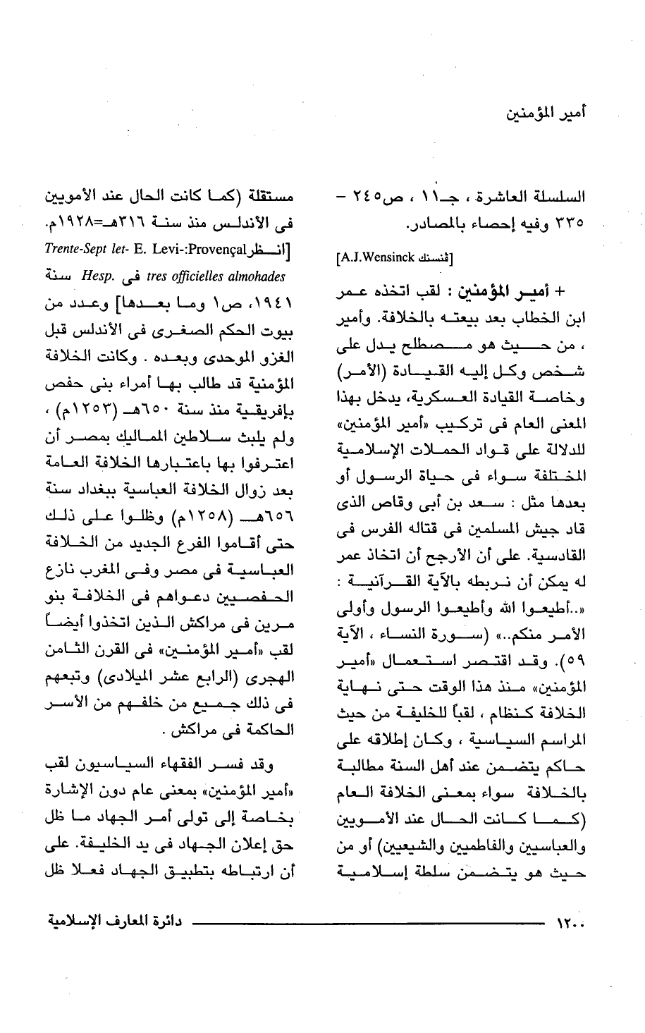 + أمير المؤمنين: لقب اتخذه عمر ابن الخطاب بعد بيعته بالخلافة. وأمير، من حيث هو مصطلح يدل على شخص وكل إليه القيادة (الأمر) وخاصة القيادة العسكرية، يدخل بهذا المعنى العام فى تركيب "أمير المؤمنين" للدلالة على قواد الحملات الإسلامية المختلفة سواء فى حياة الرسول أو بعدها مثل: سعد بن أبى وقاص الذى قاد جيش المسلمين فى قتاله الفرس فى القادسية. على أن الأرجح أن اتخاذ عمر له يمكن أن نربطه بالآية القرآنية: { ... أَطِيعُوا اللَّهَ وَأَطِيعُوا الرَّسُولَ وَأُولِي الْأَمْرِ مِنْكُمْ ... } (سورة النساء، الآية 59). وقد اقتصر استعمال "أمير المؤمنين" منذ هذا الوقت حتى نهاية الخلافة كنظام، لقباً للخليفة من حيث المراسم السياسية، وكان إطلاقه على حاكم يتضمن عند أهل السنة مطالبة بالخلافة سواء بمعنى الخلافة العام (كما كانت الحال عند الأمويين والعباسيين والفاطميين والشيعيين) أو من حيث هو يتضمن سلطة إسلامية مستقلة (كما كانت الحال عند الأمويين فى الأندلس منذ سنة 316 هـ = 1928 م. [انظر Trente-Sept let- E. Levi-: Provencal tres officielles almohades فى Hesp سنة 1941، ص 1 وما بعدها] وعدد من بيوت الحكم الصغرى فى الأندلس قبل الغزو الموحدى وبعده. وكانت الخلافة المؤمنية قد طالب بها أمراء بنى حفص بإفريقية منذ سنة 650 هـ (1253 م)، ولم يلبث سلاطين المماليك بمصر أن اعترفوا بها باعتبارها الخلافة العامة بعد زوال الخلافة العباسية ببغداد سنة 656 هـ (1258 م) وظلوا على ذلك حتى أقاموا الفرع الجديد من الخلافة العباسية فى مصر وفى المغرب نازع الحفصيين دعواهم فى الخلافة بنو مرين فى مراكش الذين اتخذوا أيضاً لقب "أمير المؤمنين" فى القرن الثامن الهجرى (الرابع عشر الميلادى) وتبعهم فى ذلك جميع من خلفهم من الأسر الحاكمة فى مراكش.