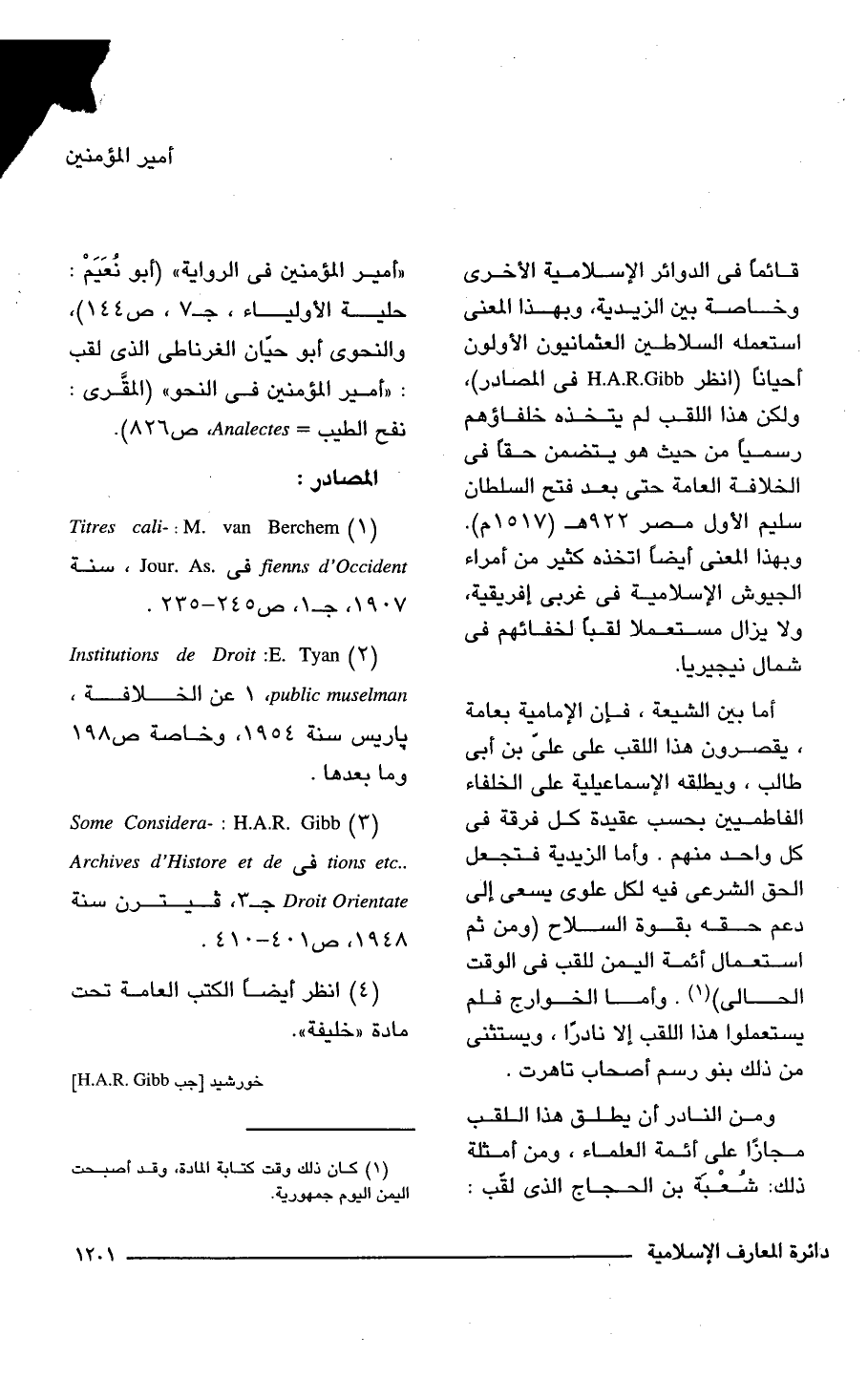 (3) Some Considera-: H.A.R. Gibb .. tions etc فى Archives d'Histore et de Droit Orientate جـ 3، فيترن سنة 1948، ص 401 - 410.