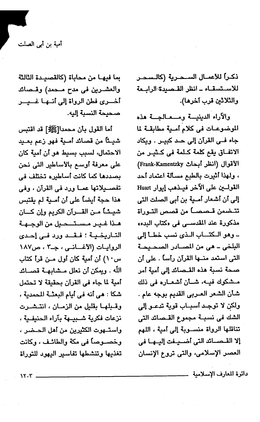أما القول بأن محمدا - صلى الله عليه وسلم - قد اقتبس شيئاً من قصائد أمية فهو زعم بعيد الاحتمال، لسبب بسيط هو أن أمية كان على معرفة أوسع بالأساطير التى نحن بصددها كما كانت أساطيره تختلف فى تفصيلاتها عما ورد فى القرآن، وفى هذا حجة أيضاً على أن أمية لم يقتبس شيئاً من القرآن الكريم وإن كان هذا غير مستحيل من الوجهة التاريخية؛ فقد ورد فى إحدى الروايات (الأغانى، جـ 3، ص 187 س 10) أن أمية كان أول من قرأ كتاب الله. ويمكن أن نعلل مشابهة قصائد أمية لما جاء فى القرآن بحقيقة لا تحتمل شكا: هى أنه فى أيام البعثة المحمدية، وقبلها بقليل من الزمان، انتشرت نزعات فكرية شبيهة بآراء الحنيفية، واستهوت الكثيرين من أهل الحضر، وخصوصاً فى مكة والطائف، وكانت تغذيها وتنشطها تفاسير اليهود للتوراة،