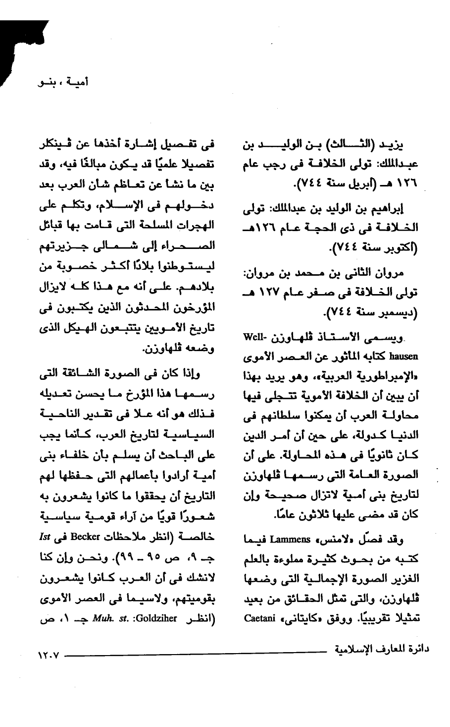 وإذا كان فى الصورة الشائقة التى رسمها هذا المؤرخ ما يحسن تعديله فذلك هو أنه علا فى تقدير الناحية السياسية لتاريخ العرب، كأنما يجب على الباحث أن يسلم بأن خلفاء بنى أمية أرادوا بأعمالهم التى حفظها لهم التاريخ أن يحققوا ما كانوا يشعرون به شعورًا قوياً من آراء قومية سياسية خالصة (انظر ملاحظات Becker فى Ist جـ 9، ص 95 - 99). ونحن وإن كنا لا نشك فى أن العرب كانوا يشعرون بقوميتهم، ولاسيما فى العصر الأموى (انظر Muh .st.: Goldziher جـ 1، ص