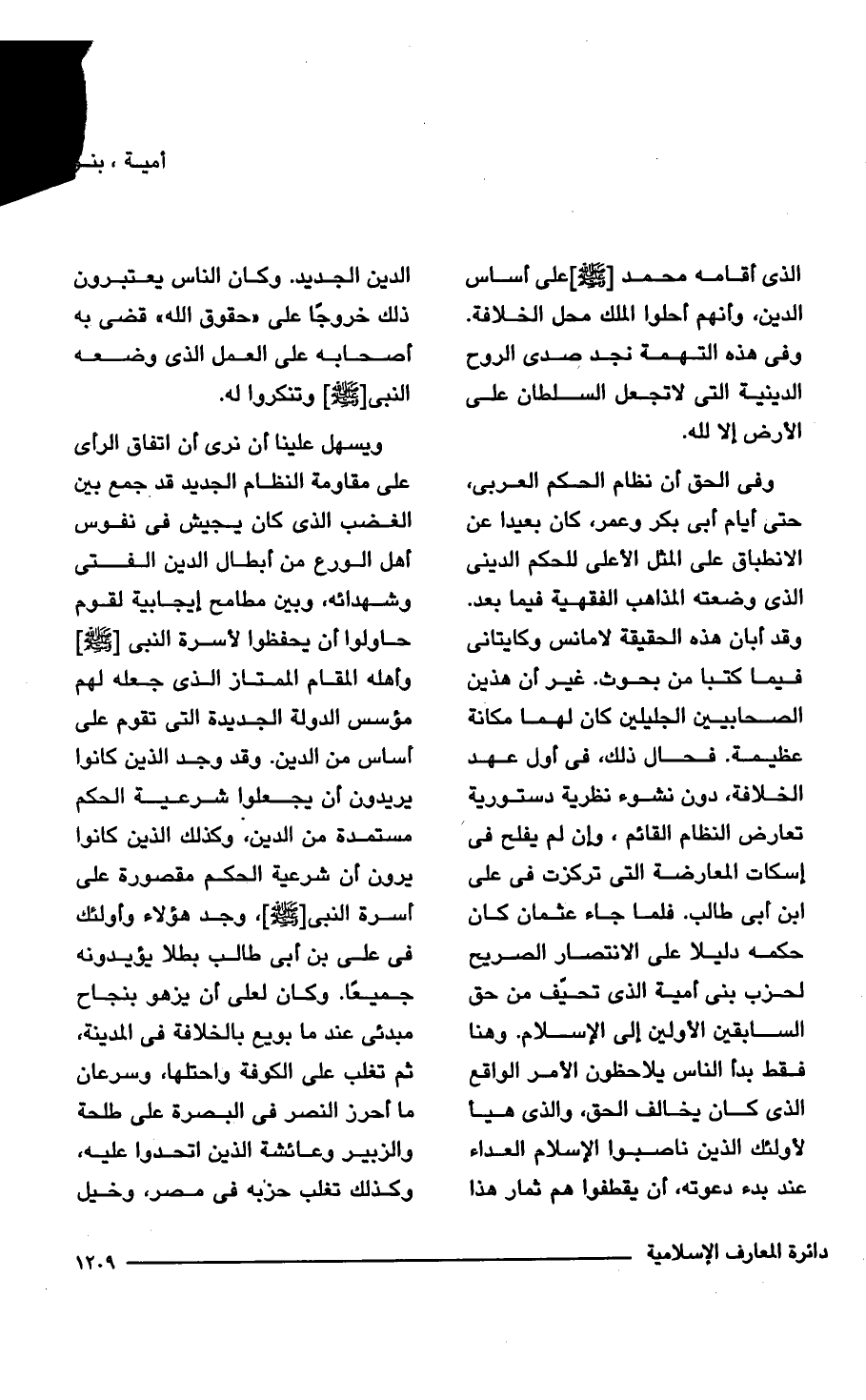 وفى الحق أن نظام الحكم العربى، حتى أيام أبى بكر وعمر، كان بعيدا عن الانطباق على المثل الأعلى للحكم الدينى الذى وضعته المذاهب الفقهية فيما بعد. وقد أبان هذه الحقيقة لامانس وكايتانى فيما كتبا من بحوث. غير أن هذين الصحابيين الجليلين كان لهما مكانة عظيمة. فحال ذلك، فى أول عهد الخلافة، دون نشوء نظرية دستورية تعارض النظام القائم، وإن لم يفلح فى إسكات المعارضة التى تركزت فى على ابن أبى طالب. فلما جاء عثمان كان حكمه دليلا على الانتصار الصريح لحزب بنى أمية الذى تحيّف من حق السابقين الأولين إلى الإسلام. وهنا فقط بدأ الناس يلاحظون الأمر الواقع الذى كان يخالف الحق، والذى هيأ لأولئك الذين ناصبوا الإسلام العداء عند بدء دعوته، أن يقطفوا هم ثمار هذا الدين الجديد. وكان الناس يعتبرون ذلك خروجاً على "حقوق الله" قضى به أصحابه على العمل الذى وضعه النبى - صلى الله عليه وسلم - وتنكروا له.