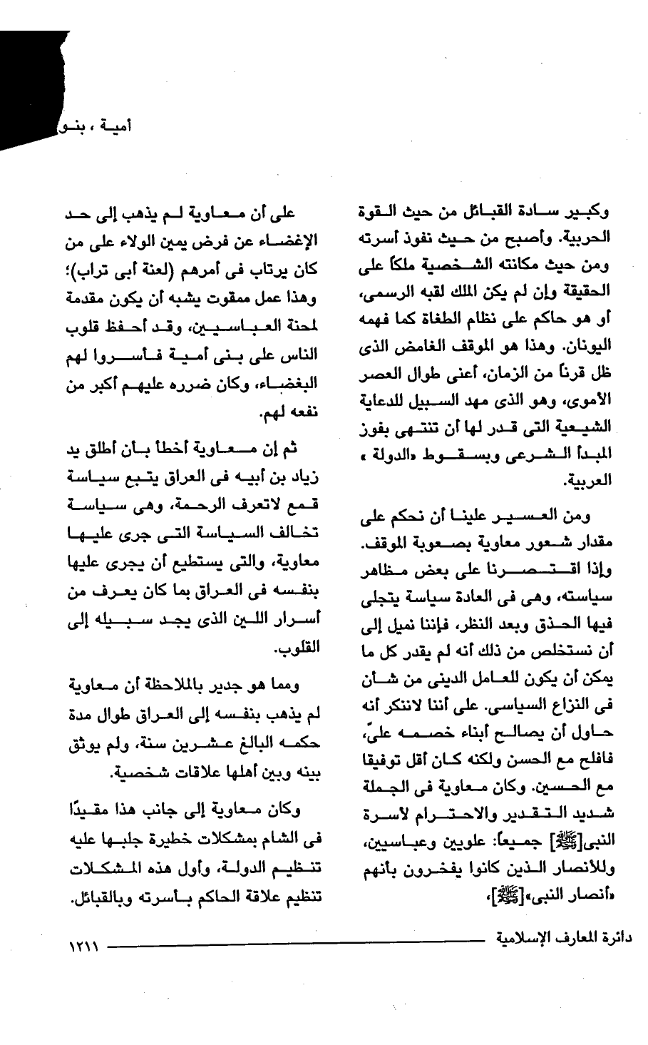 ومن العسير علينا أن نحكم على مقدار شعور معاوية بصعوبة الموقف. وإذا اقتصرنا على بعض مظاهر سياسته، وهى فى العادة سياسة يتجلى فيها الحذق وبعد النظر، فإننا نميل إلى أن نستخلص من ذلك أنه لم يقدر كل ما يمكن أن يكون للعامل الدينى من شأن فى النزاع السياسى. على أننا لا ننكر أنه حاول أن يصالح أبناء خصمه على، فأفلح مع الحسن ولكنه كان أقل توفيقا مع الحسين. وكان معاوية فى الجملة شديد التقدير والاحترام لأسرة النبى [- صلى الله عليه وسلم -] جميعاً: علويين وعباسيين، وللأنصار الذين كانوا يفخرون بأنهم "أنصار النبى" [- صلى الله عليه وسلم -]