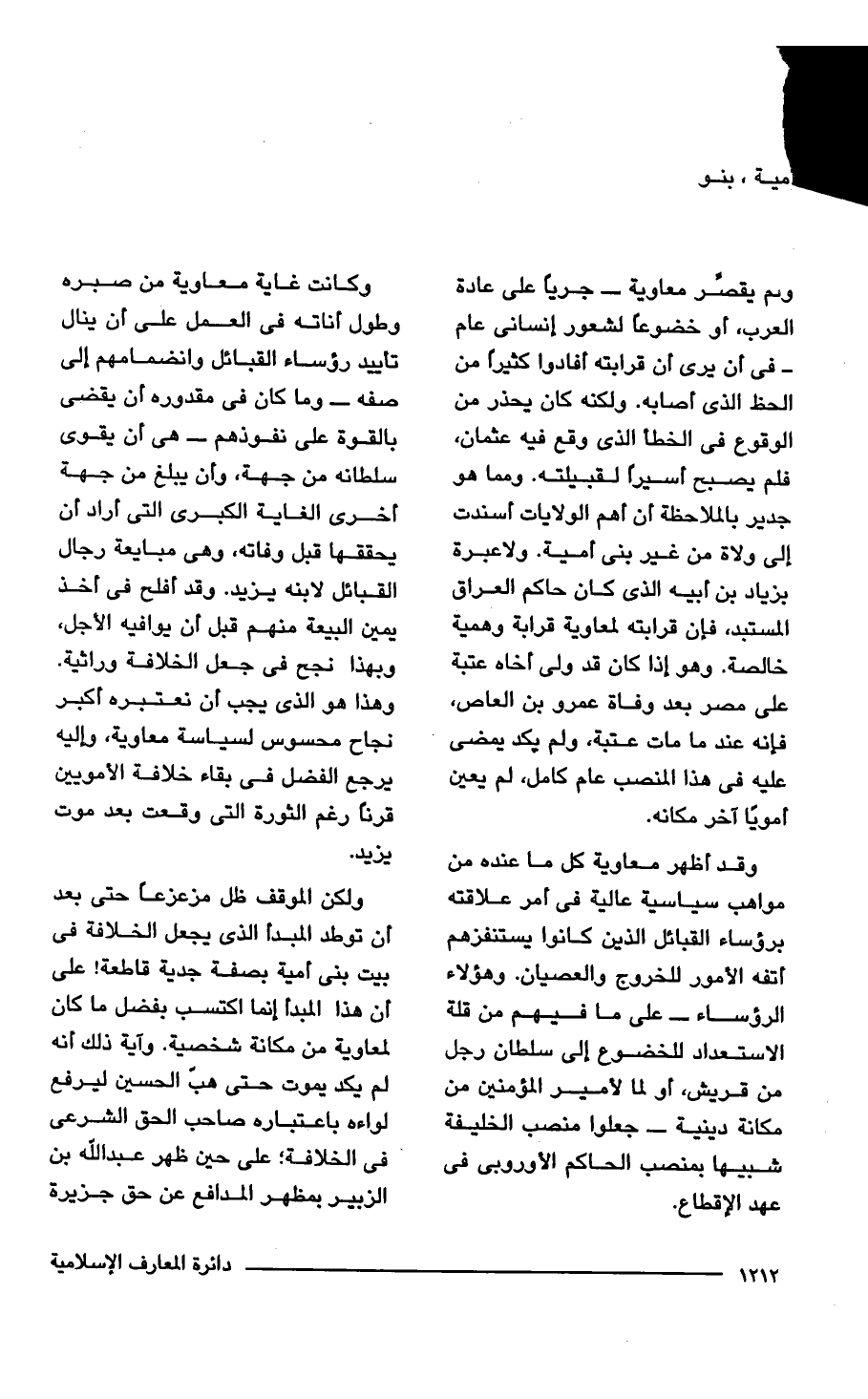 ولكن الموقف ظل مزعزعاً حتى بعد أن توطد المبدأ الذى يجعل الخلافة فى بيت بنى أمية بصفة جدية قاطعة! على أن هذا المبدأ إنما اكتسب بفضل ما كان لمعاوية من مكانة شخصية. وآية ذلك أنه لم يكد يموت حتى هبّ الحسين ليرفع لواءه باعتباره صاحب الحق الشرعى فى الخلافة؛ على حين ظهر عبد الله بن الزبير بمظهر المدافع عن حق جزيرة