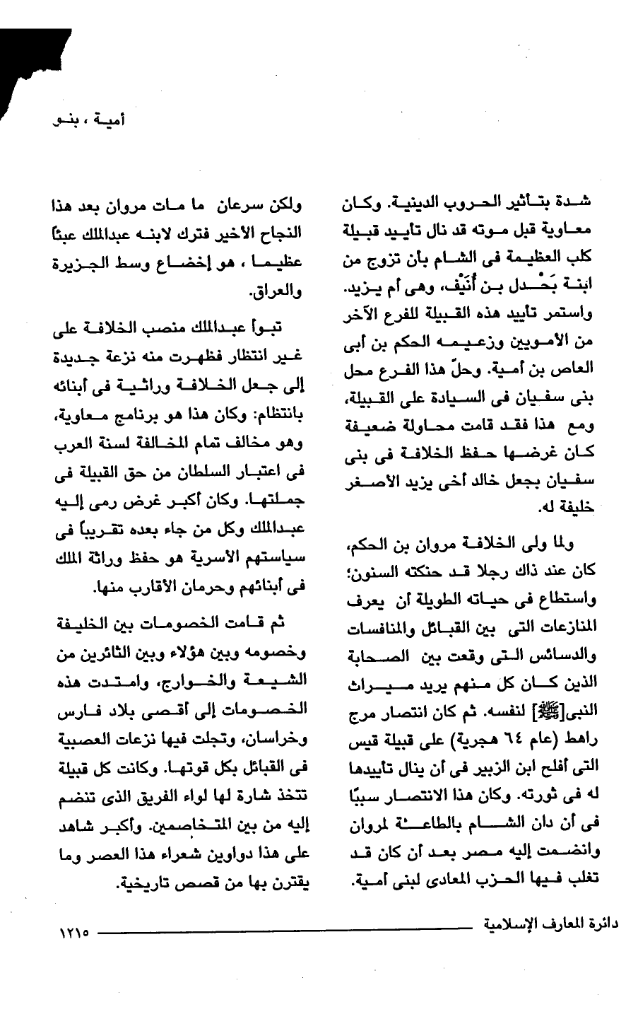 شدة بتأثير الحروب الدينية. وكان معاوية قبل موته قد نال تأييد قبيلة كلب العظيمة فى الشام بأن تزوج من ابنة بَحْدل بن أُنَيْف، وهى أم يزيد. واستمر تأييد هذه القبيلة للفرع الآخر من الأمويين وزعيمه الحكم بن أبى العاص بن أمية. وحلّ هذا الفرع محل بنى سفيان فى السيادة على القبيلة، ومع هذا فقد قامت محاولة ضعيفة كان غرضها حفظ الخلافة فى بنى سفيان بجعل خالد أخى يزيد الأصغر خليفة له.
