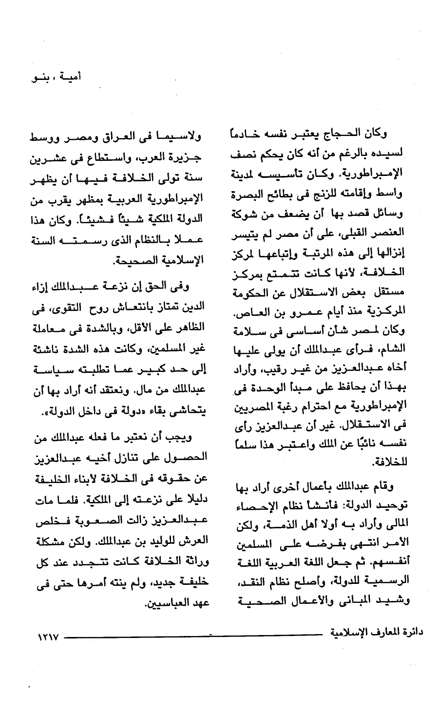 وكان الحجاج يعتبر نفسه خادماً لسيده بالرغم من أنه كان يحكم نصف الإمبراطورية. وكان تأسيسه لمدينة واسط وإقامته للزنج فى بطائح البصرة وسائل قصد بها أن يضعف من شوكة العنصر القبلى، على أن مصر لم يتيسر إنزالها إلى هذه المرتبة وإتباعها لمركز الخلافة، لأنها كانت تتمتع بمركز مستقل بعض الاستقلال عن الحكومة المركزية منذ أيام عمرو بن العاص. وكان لمصر شأن أساسى فى سلامة الشام، فرأى عبد الملك أن يولى عليها أخاه عبد العزيز من غير رقيب، وأراد بهذا أن يحافظ على مبدأ الوحدة فى الإمبراطورية مع احترام رغبة المصريين فى الاستقلال. غير أن عبد العزيز رأى نفسه نائبًا عن الملك واعتبر هذا سلماً للخلافة.