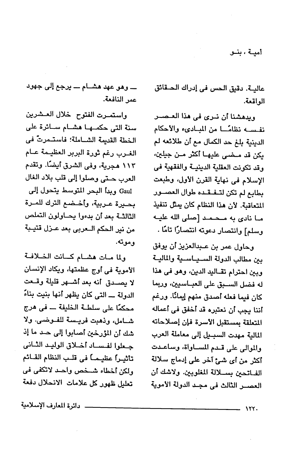 وحاول عمر بن عبد العزيز أن يوفق بين مطالب الدولة السياسية والمالية وبين احترام تقاليد الدين، وهو فى هذا له فضل السبق على العباسيين، وربما كان فيما فعله أصدق منهم إيمانًا. ورغم أننا يجب أن نعتبره قد أخفق فى أعماله المتعلقة بمستقبل الأسرة فإن إصلاحاته المالية مهدت السبيل إلى معاملة العرب والموالى على قدم المساواة، وساعدت أكثر من أى شئ آخر على إدماج سلالة الفاتحين بسلالة المغلوبين. ولاشك أن العصر الثالث فى مجد الدولة الأموية -وهو عهد هشام- يرجع إلى جهود عمر النافعة.