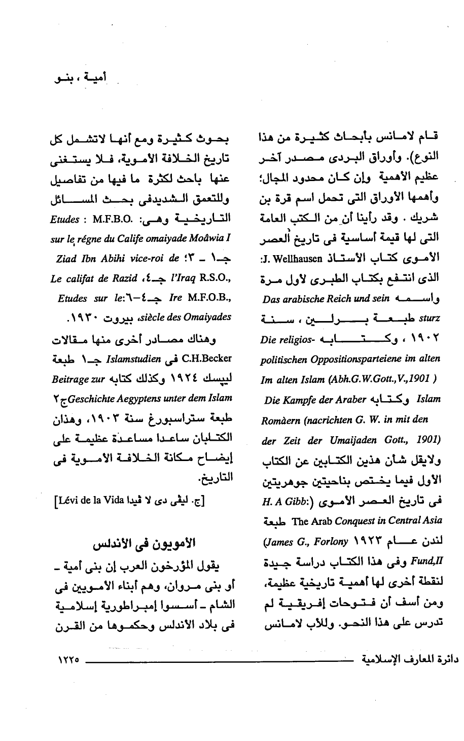 قام لامانس بأبحاث كثيرة من هذا النوع). وأوراق البردى مصدر آخر عظيم الأهمية وإن كان محدود المجال؛ وأهمها الأوراق التى تحمل اسم قرة بن شريك. وقد رأينا أن من الكتب العامة التى لها قيمة أساسية فى تاريخ العصر الأموى كتاب الأستاذ J. Wellhausen: الذى انتفع بكتاب الطبرى لأول مرة واسمه Das arabische Reich und sein sturz طبعة برلين، سنة 1902، وكتابه Die religios- politischen Oppositionsparteiene im alten Im alten Islam (Abh.G.W.Gott.,V.,1901) Islam وكتابه Die Kampfe der Araber in mit den Romaern (nacrichten G.W. (1901,.der Zeit der Umaijaden Gott ولايقل شأن هذين الكتابين عن الكتاب الأول فيما يختص بناحيتين جوهريتين فى تاريخ العصر الأموى (: A Gibb H. The Arab Conquest in entral Asia طبعة لندن عام 1923 James G., Forlony) Fund,II وفى هذا الكتاب دراسة جيدة لنقطة أخرى لها أهمية تاريخية عظيمة، ومن أسف أن فتوحات إفريقية لم تدرس على هذا النحو. وللأب لامانس بحوث كثيرة ومع أنها لا تشمل كل تاريخ الخلافة الأموية، فلا يستغنى عنها باحث لكثرة ما فيها من تفاصيل وللتعمق الشديد فى بحث المسائل التاريخية وهى: . Etudes: M.F.B.O sur le regne du Calife omaiyade Moawia I جـ 1 - 3؛ Ziad Ibn Abihi vice-roi de I'Iraq R.S.O., جـ 4، califat de Razid Le ,.Ire M.F.O.B جـ 4 - 6: le Etudes sur Omaiyades siecle des، بيروت 1930.