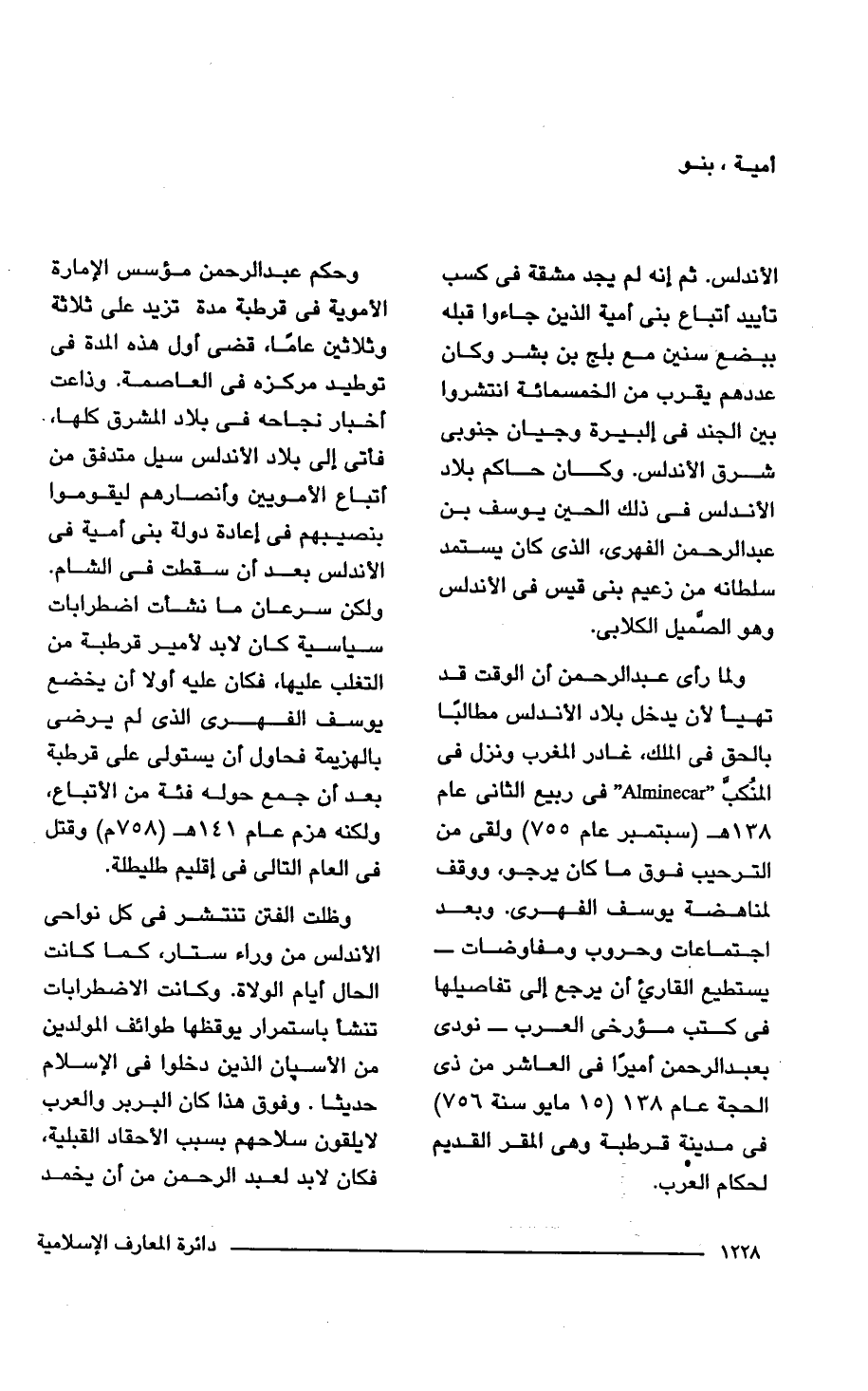 ولما رأى عبد الرحمن أن الوقت قد تهيأ لأن يدخل بلاد الأندلس مطالبًا بالحق فى الملك، غادر المغرب ونزل فى المنُكبَّ " Alminecar" فى ربيع الثانى عام 138 هـ (سبتمبر عام 755) ولقى من الترحيب فوق ما كان يرجو، ووقف لمناهضة يوسف الفهرى. وبعد اجتماعات وحروب ومفاوضات -يستطيع القاريء أن يرجع إلى تفاصيلها فى كتب مؤرخى العرب- نودى بعبدالرحمن أميرًا فى العاشر من ذى الحجة عام 138 (15 مايو سنة 756) فى مدينة قرطبة وهى المقر القديم لحكام العرب.