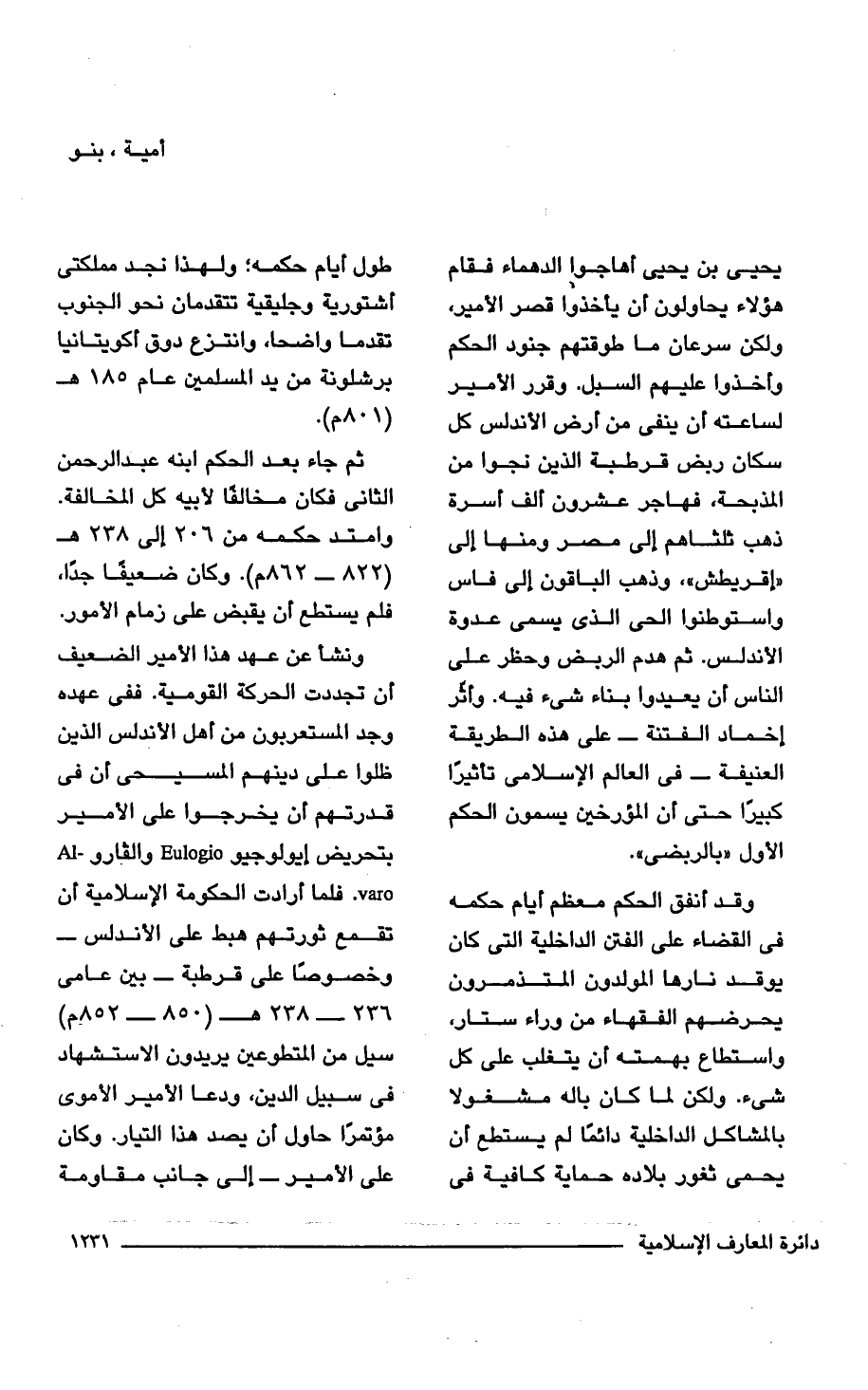 ثم جاء بعد الحكم ابنه عبد الرحمن الثانى فكان مخالفًا لأبيه كل المخالفة. وامتد حكمه من 206 إلى 238 هـ (822 - 862 م). وكان ضعيفًا جدًا، فلم يستطع أن يقبض على زمام الأمور. ونشأ عن عهد هذا الأمير الضعيف أن تجددت الحركة القومية. ففى عهده وجد المستعربون من أهل الأندلس الذين ظلوا على دينهم المسيحى أن فى قدرتهم أن يخرجوا على الأمير بتحريض إيولوجيو Eulogio والفارو- Al varo. فلما أرادت الحكومة الإسلامية أن تقمع ثورتهم هبط على الأندلس -وخصوصًا على قرطبة- بين عامى 236 - 238 هـ (850 - 852 م) سيل من المتطوعين يريدون الاستشهاد فى سبيل الدين، ودعا الأمير الأموى مؤتمرًا حاول أن يصد هذا التيار. وكان على الأمير -إلى جانب مقاومة