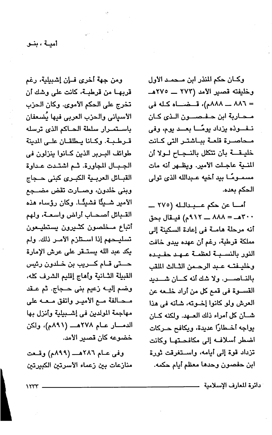 أما عن حكم عبد الله (275 - 300 هـ = 888 - 912 م) فيقال بحق أنه مرحلة هامة فى إعادة السكينة إلى مملكة قرطبة، رغم أن عهده يبدو خافت النور بالنسبة لعظمة عهد حفيده وخليفته عبد الرحمن الثالث الملقب بالناصر. ولا شك أنه كان شديد القسوة فى قمع كل من أراد خلعه عن العرش ولو كانوا إخوته، شأنه فى هذا شأن كل أمراء ذلك العهد. ولكنه كان يواجه أخطارًا عديدة، ويكافح حركات اضطر أسلافه إلى مكافحتها وكانت تزداد قوة إلى أيامه، واستغرقت ثورة ابن حفصون وحدها معظم أيام حكمه.