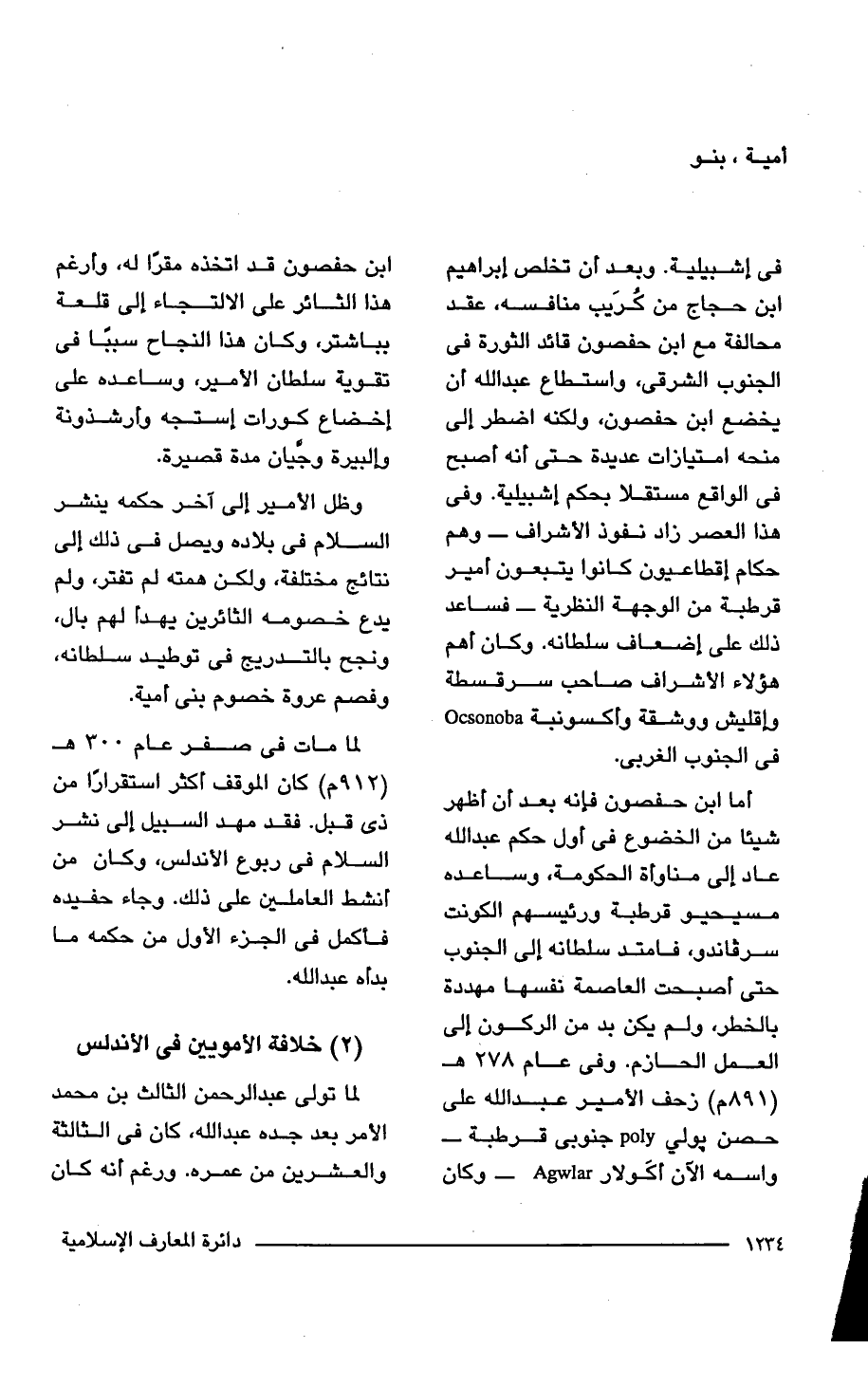 فى إشبيلية. وبعد أن تخلص إبراهيم ابن حجاج من كُرَيب منافسه، عقد محالفة مع ابن حفصون قائد الثورة فى الجنوب الشرقى، واستطاع عبد الله أن يخضع ابن حفصون، ولكنه اضطر إلى منحه امتيازات عديدة حتى أنه أصبح فى الواقع مستقلا بحكم إشبيلية. وفى هذا العصر زاد نفوذ الأشراف -وهم حكام إقطاعيون كانوا يتبعون أمير قرطبة من الوجهة النظرية- فساعد ذلك على إضعاف سلطانه. وكان أهم هؤلاء الأشراف صاحب سرقسطة وإقليش ووشقة وأكسونبة Ocsonoba فى الجنوب الغربى.
