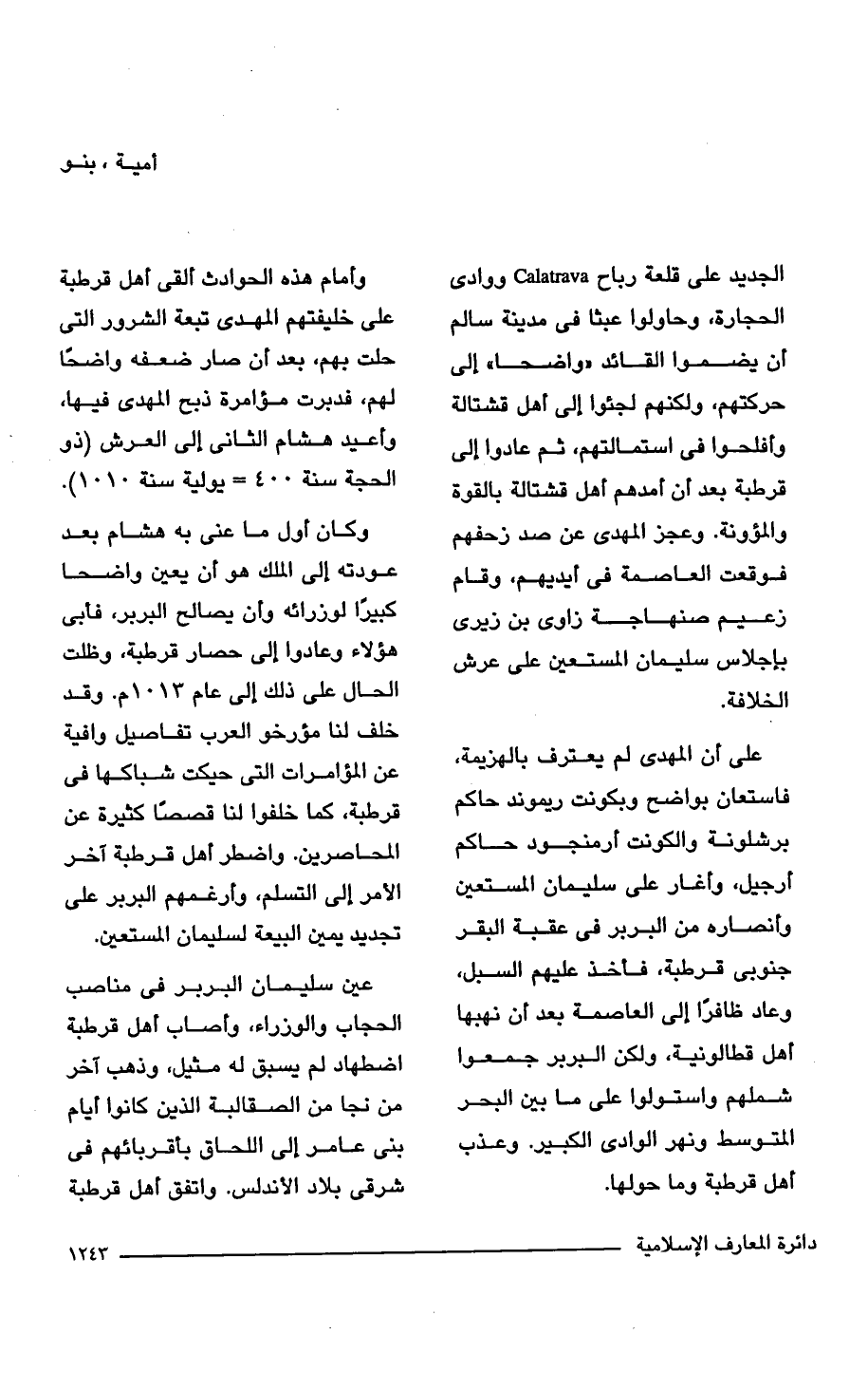 الجديد على قلعة رباح Calatrava ووادى الحجارة، وحاولوا عبثًا فى مدينة سالم أن يضموا القائد "واضحًا" إلى حركتهم، ولكنهم لجئوا إلى أهل قشتالة وأفلحوا فى استمالتهم، ثم عادوا إلى قرطبة بعد أن أمدهم أهل قشتالة بالقوة والمؤونة. وعجز المهدى عن صد زحفهم فوقعت العاصمة فى أيديهم، وقام زعيم صنهاجة زاوى بن زيرى بإجلاس سليمان المستعين على عرش الخلافة.