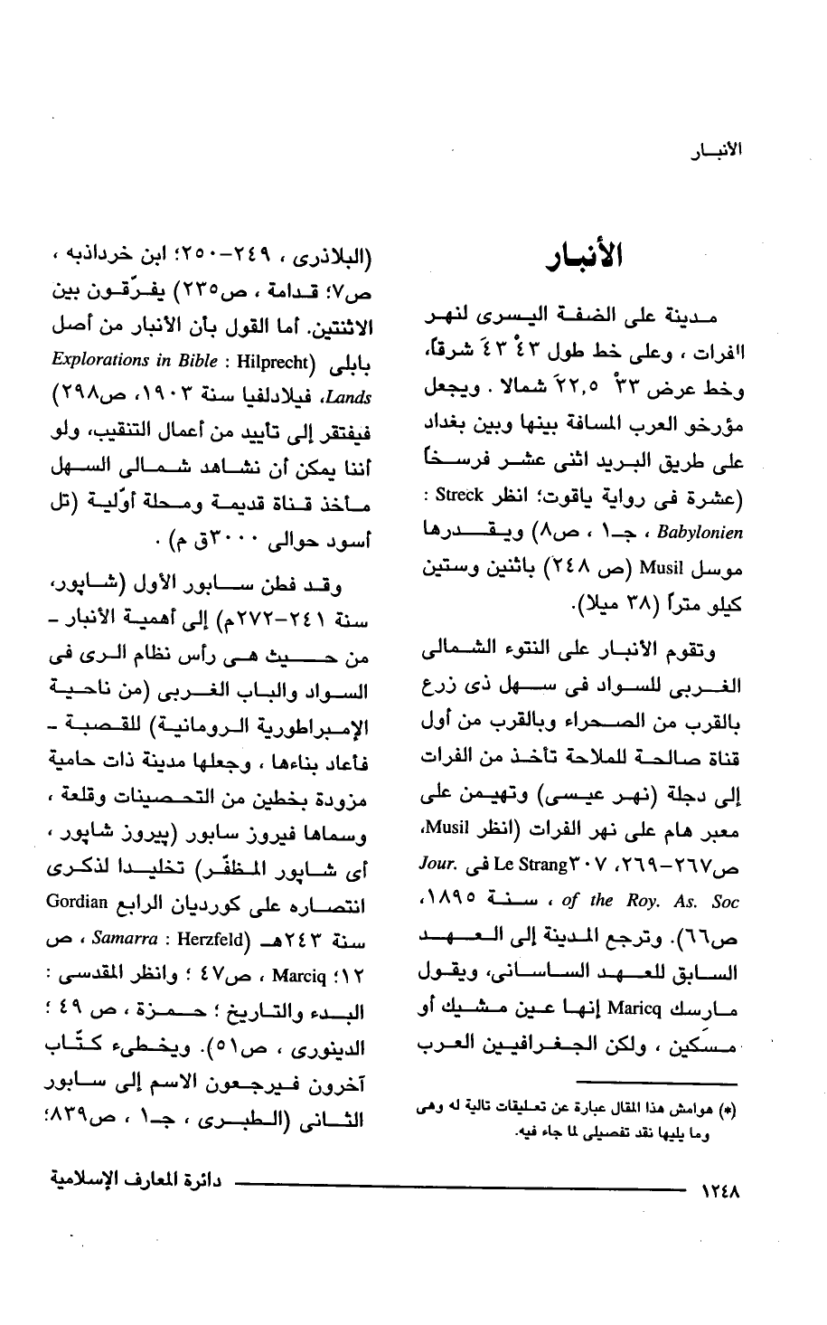 وتقوم الأنبار على النتوء الشمالى الغربى للسواد فى سهل ذى زرع بالقرب من الصحراء وبالقرب من أول قناة صالحة للملاحة تأخذ من الفرات إلى دجلة (نهر عيسى) وتهيمن على معبر هام على نهر الفرات (انظر Musil. ص 267 - 269 , 307 Strang Le فى Jour of the Roy. As. Soc، سنة 1895، ص 66). وترجع المدينة إلى العهد السابق للعهد الساسانى، ويقول مارسك Maricq إنها عين مشيك أو مسَكين، ولكن الجغرافيين العرب (البلاذرى، 249 - 250؛ ابن خرداذبه، ص 7؛ قدامة، ص 235) يفرّقون بين الاثنتين. أما القول بأن الأنبار من أصل بابلى (Explorations in Bible: Hilprecht Lands، فيلادلفيا سنة 1903، ص 298) فيفتقر إلى تأييد من أعمال التنقيب، ولو أننا يمكن أن نشاهد شمالى السهل مأخذ قناة قديمة ومحلة أوّلية (تل أسود حوالى 3000 ق م).