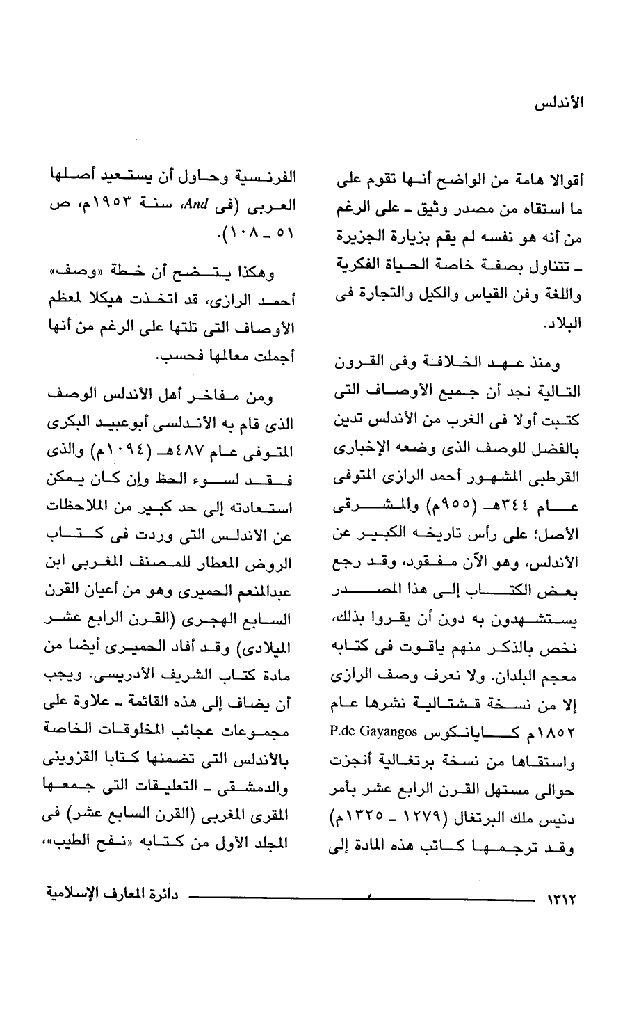 ومنذ عهد الخلافة وفي القرون التالية نجد أن جميع الأوصاف التي كتبت أولًا في الغرب من الأندلس تدين بالفضل للوصف الذي وضعه الإخباري القرطبي المشهور أَحْمد الرَّازي المتوفى عام 344 هـ (955 م) والمشرقي الأصل؛ على رأس تاريخه الكبير عن الأندلس، وهو الآن مفقود، وقد رجع بعض الكتاب إلى هذا المصدر يستشهدون به دون أن يقروا بذلك, نخص بالذكر منهم ياقوت في كتابه معجم البلدان. ولا نعرف وصف الرَّازي إلَّا من نسخة قشتالية نشرها عام 1852 م كايانكوس P.de Gayangos واستقاها من نسخة برتغالية أنجزت حوالي مستهل القرن الرابع عشر بأمر دنيس ملك البرتغال (1279 - 1325 م) وقد ترجمها كاتب هذه المادة إلى الفرنسية وحاول أن يستعيد أصلها العربي (في And، سنة 1953 م، ص 51 - 108).