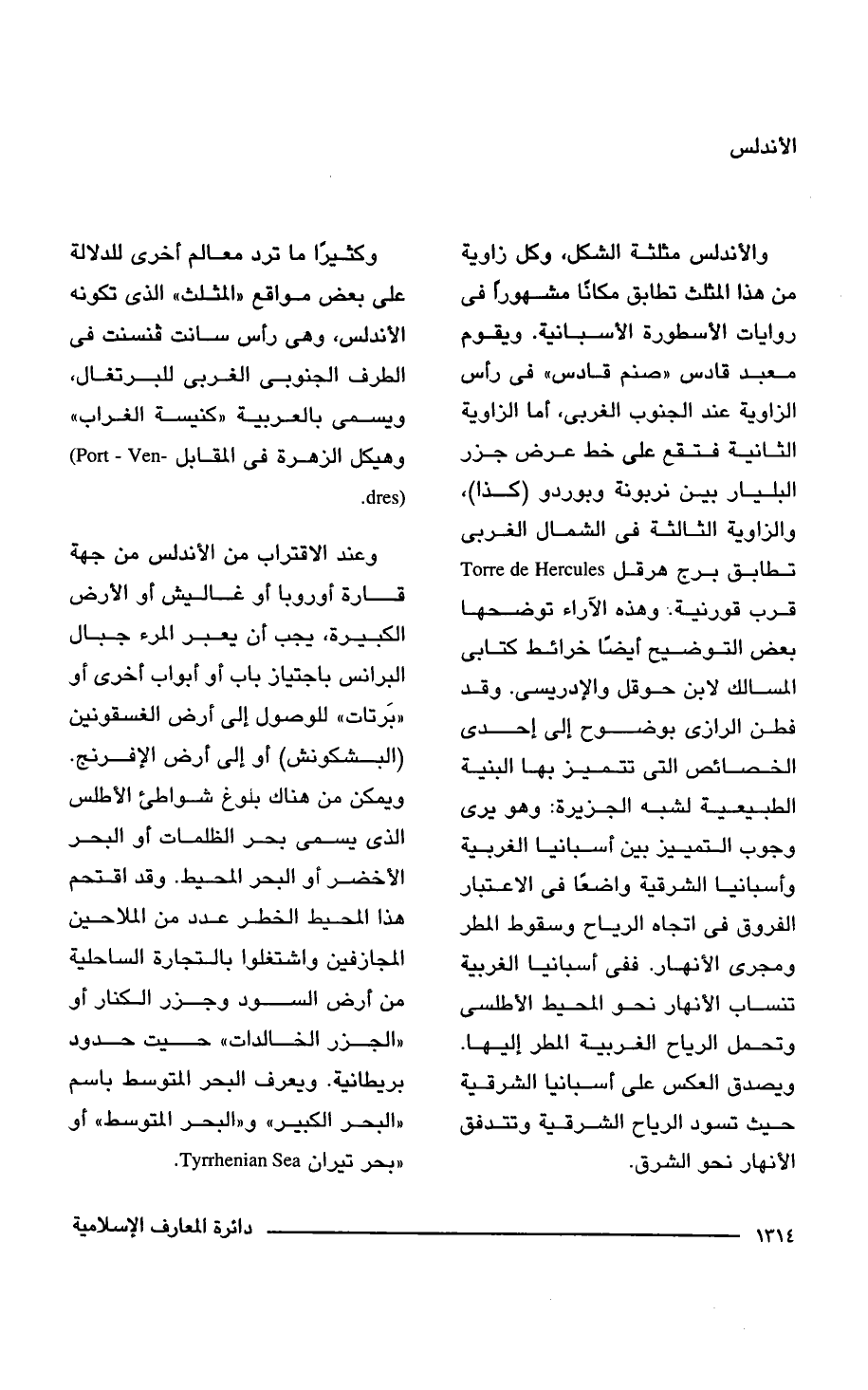 وعند الاقتراب من الأندلس من جهة قارة أوروبا أو غاليش أو الأرض الكبيرة، يجب أن يعبر المرء جبال البرانس باجتياز باب أو أبواب أخرى أو "بَرتات" للوصول إلى أرض الغسقونين (البشكونش) أو إلى أرض الإفرنج. ويمكن من هناك بلوغ شواطن الأطلس الذي يسمى بحر الظلمات أو البحر الأخضر أو البحر المحيط. وقد اقتحم هذا المحيط الخطر عدد من الملاحين المجازفين واشتغلوا بالتجارة الساحلية من أرض السود وجزر الكنار أو "الجزر الخالدات" حيث حدود بريطانية. ويعرف البحر المتوسط باسم "البحر الكبير" و"البحر المتوسط". أو "بحر تيران Tyrrhenian Sea .