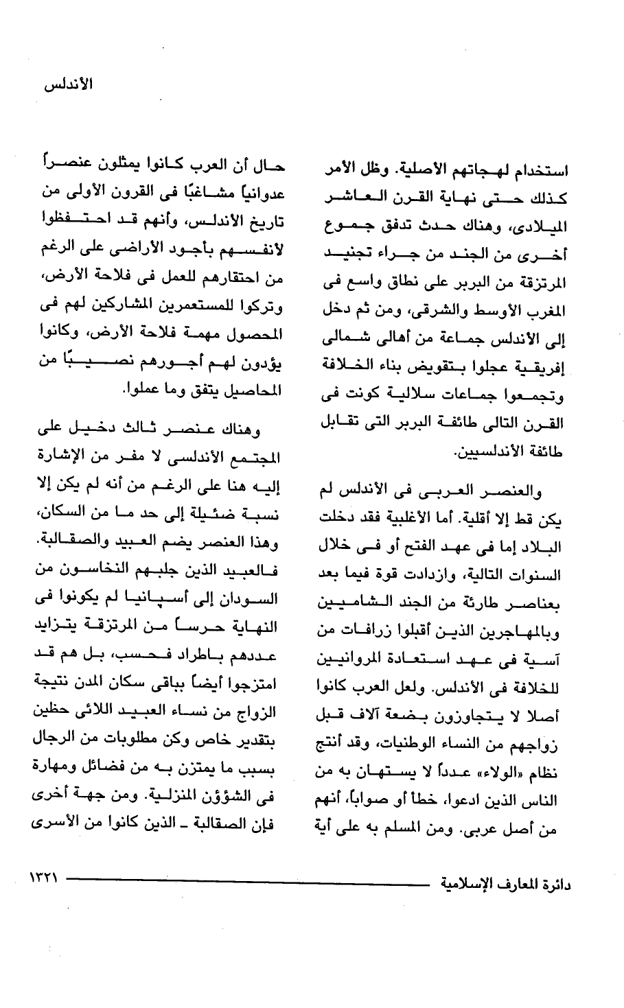 استخدام لهجاتهم الأصلية. وظل الأمر كذلك حتى نهاية القرن العاشر الميلادي، وهناك حدث تدفق جموع أخرى من الجند من جراء تجنيد المرتزقة من البربر على نطاق واسع في المغرب الأوسط والشرقى، ومن ثم دخل إلى الأندلس جماعة من أهالى شمالي إفريقية عجلوا بتقويض بناء الخلافة وتجمعوا جماعات سلالية كونت في القرن التالي طائفة البربر التي تقابل طائفة الأندلسيين. والعنصر العربي في الأندلس لم يكن قط إلَّا أقلية. أما الأغلبية فقد دخلت البلاد إما في عهد الفتح أو في خلال السنوات التالية، وازدادت قوة فيما بعد بعناصر طارئة من الجند الشاميين وبالمهاجرين الذين أقبلوا زرافات من آسية في عهد استعادة المروانيين للخلافة في الأندلس. ولعل العرب كانوا أصلا لا يتجاوزون بضعة آلاف قبل زواجهم من النساء الوطنيات، وقد أنتج نظام "الولاء" عددًا لا يستهان به من النَّاس الذين ادعوا, خطأ أو صوابًا، أنَّهم من أصل عربي. ومن المسلم به على آية حال أن العرب كانوا يمثلون عنصرًا عدوانيًا مشاغبًا في القرون الأولى من تاريخ الأندلس، وأنهم قد احتفظوا لأنفسهم بأجود الأراضى على الرغم من احتقارهم للعمل في فلاحة الأرض، وتركوا للمستعمرين المشاركين لهم في المحصول مهمة فلاحة الأرض، وكانوا يؤدون لهم أجورهم نصيبًا من المحاصيل يتفق وما عملوا.