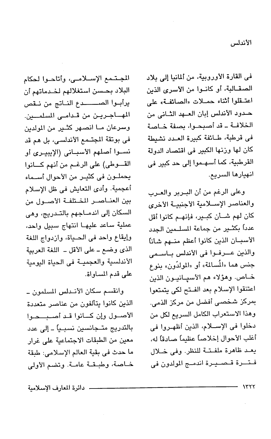 وعلى الرغم من أن البربر والعرب والعناصر الإِسلامية الأجنبية الأخرى كان لهم شأن كبير، فإنهم كانوا أقل عددًا بكثير من جماعة المسلمين الجدد الأسبان الذين كانوا أعظم منهم شأنًا والذين عرفوا في الأندلس باسمى جنس هما "المُسالمة" أو "المولدّون" بنوع خاص. وهؤلاء هم الأسبانيون الذين اعتنقوا الإِسلام بعد الفتح لكي يتمتعوا بمركز شخصي أفضل من مركز الذمي. وهذا الاستعراب الكامل السريع لكل من دخلوا في الإِسلام، الذين أظهروا في أغلب الأحوال إخلاصًا عظيمًا صادقًا له، يعد ظاهرة ملفتة للنظر. وفي خلال فترة قصيرة اندمج المولدون في المجتمع الإِسلامي، وأتاحوا لحكام البلاد بحسن استغلالهم لخدماتهم أن يرأبوا الصدع الناتج من نقص المهاجرين من قدامى المسلمين. وسرعان ما انصهر كثير من المولدين في بوتقة المجتمع الأَنْدلسيّ، بل هم قد نسوا أصلهم الأسباني (الإيبيرى أو القوطي) على الرغم من أنَّهم كانوا يحملون في كثير من الأحوال أسماء أعجمية. وأدى التعايش في ظل الإِسلام بين العناصر المختلفة الأصول من السكان إلى اندماجهم بالتدريج، وهي عملية ساعد عليها انتهاج سبيل واحد، وإيقاع واحد في الحياة، وازدواج اللغة الذي وضع -على الأقل- اللغة العربية الأندلسية والعجمية في الحياة اليومية على قدم المساواة.