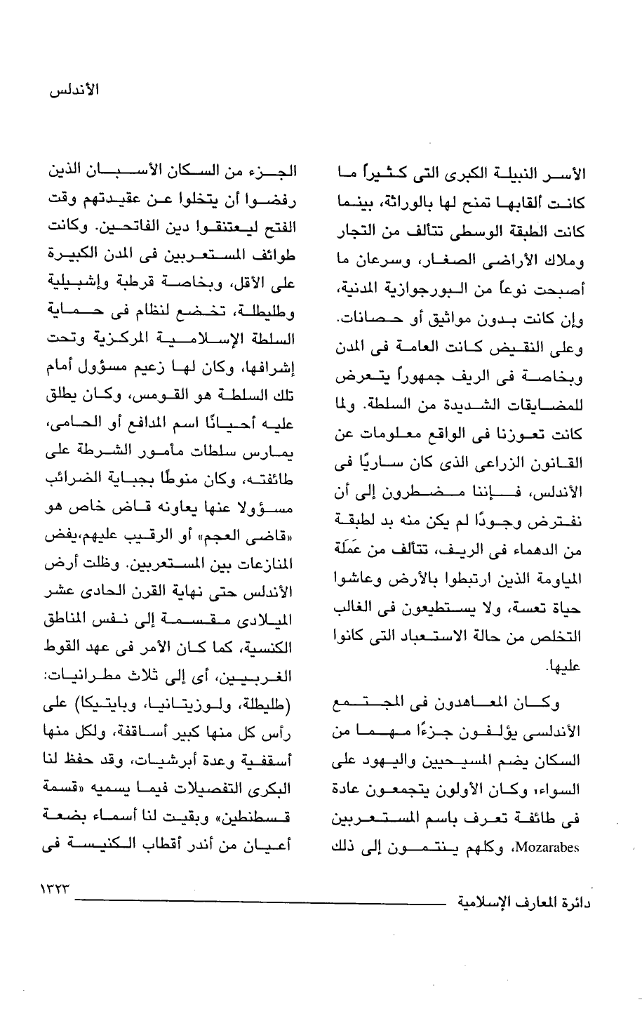 الأسر النبيلة الكبرى التي كثيرًا ما كانت ألقابها تمنح لها بالوراثة، بينما كانت الطَّبقة الوسطى تتألف من التجار وملاك الأراضي الصغار، وسرعان ما أصبحت نوعا من البورجوازية المدنية، وإن كانت بدون مواثيق أو حصانات. وعلى النقيض كانت العامة في المدن وبخاصة في الريف جمهورًا يتعرض للمضايقات الشديدة من السلطة. ولما كانت تعوزنا في الواقع معلومات عن القانون الزراعي الذي كان ساريًا في الأندلس، فإننا مضطرون إلى أن نفترض وجودًا لم يكن منه بد لطبقة من الدهماء في الريف، تتألف من عَمَلة المياومة الذين ارتبطوا بالأرض وعاشوا حياة تعسة، ولا يستطيعون في الغالب التخلص من حالة الاستعباد التي كانوا عليها.
