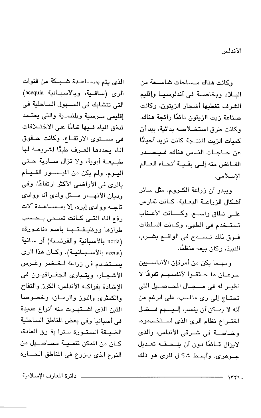 ومهما يكن من أمر فإن الأندلسيين سرعان ما حققوا لأنفسهم تفوقًا لا نظير له في مجال المحاصيل التي تحتاج إلى ري مناسب، على الرغم من أنَّه لا يمكن أن ينسب إليهم فضل اختراع نظام الري الذي استخدموه، وخاصة في شرقي الأندلس، والذي لا يزال قائمًا دون أن يلحقه تعديل جوهري. وأبسط شكل للري هو ذلك الذي يتم بمساعدة شبكة من قنوات الري (ساقية، وبالأسبانية acequia) التي تتشابك في السهول الساحلية في إقليمي مرسية وبلنسية والتي يعتمد تدفق المياه فيها تمامًا على الاختلافات في مستوى الارتفاع. وكانت حقوق الماء يحددها العرف طبقًا لشريعة لها طبيعة أبوية، ولا تزال سارية حتَّى اليوم. ولم يكن من الميسور القيام بالري في الأراضي الأكثر ارتفاعًا, وفي وديان الأنهار مثل وادي آنا ووادي تاجه ووادي إبره، إلَّا بمساعدة آلات رفع الماء التي كانت تسمى بحسب طرازها ووظيفتها باسم "ناعورة" (noria بالأسبانية والفرنسية) أو سانية (acena بالأسبانية). وكان هذا الري يستخدم في زراعة الخضر وغرس الأشجار، ويتبارى الجغرافيون في الإشادة بفواكه الأندلس: الكرز والتفاح والكمثرى واللوز والرمان، وخصوصًا التين الذي اشتهرت منه أنواع عديدة في أسبانيا وفي بعض المناطق الساحلية الضيقة المستورة سترا يفوق العادة، كان من الممكن تنمية محاصيل من النوع الذي يزرع في المناطق الحارة