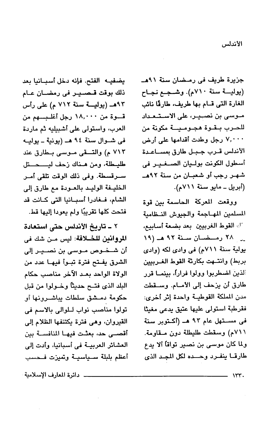 ووقعت المعركة الحاسمة بين قوة المسلمين المهاجمة والجيوش النظامية [. . .] (*) القوط الغربيين بعد بضعة أسابيع، [. . . .] (*) 28 رمضان سنة 92 هـ (19 يولية سنة 711 م) في وادي لكه (وادي بربط) وانتهت بكارثة القوط الغربيين الذين اضطربوا وولوا فرارًا، بينما قرر طارق أن يزحف إلى الإمام. وسقطت مدن المملكة القوطية واحدة إثر أخرى: فقرطبة استولى عليها عتيق يدعى مغيثا في مستهل عام 93 هـ (أكتوبر سنة 711 م) وسقطت طليطلة دون مقاومة. ولما كان موسى بن نصير تواقًا ألا يدع طارقا ينفرد وحده لكل المجد الذي يضفيه الفتح. فإنَّه دخل أسيانيا بعد ذلك بوقت قصير في رمضان عام 93 هـ (يولية سنة 712 م) على رأس قوة من 18.000 رجل أغلبهم من العرب، واستولى على أشبيليه ثم ماردة في شوال سنة 94 هـ (يونية- يوليه 713) والتقى موسى بطارق عند طليطلة، ومن هناك زحف ليحتل سرقسطة. وفي ذلك الوقت تلقى أمر الخليفة الوليد بالعودة مع طارق إلى الشَّام، فغادرا أسبانيا التي كانت قد فتحت كلها تقريبًا ولم يعودا إليها قط.