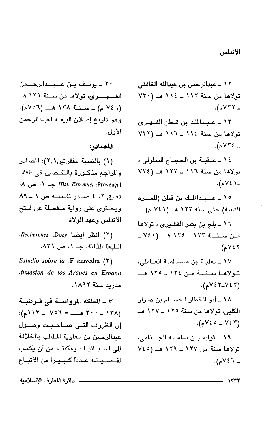 (1) بالنسبة للفقرتين 2.1): المصادر والمراجع مذكورة بالتفصيل في - Levi Hist. Esp.mus.: Provencal جـ 1، ص 8، تعليق 2، المصدر نفسه ص 1 - 89 ويحتوي على رواية مفصلة عن فتح الأندلس وعهد الولاة.
