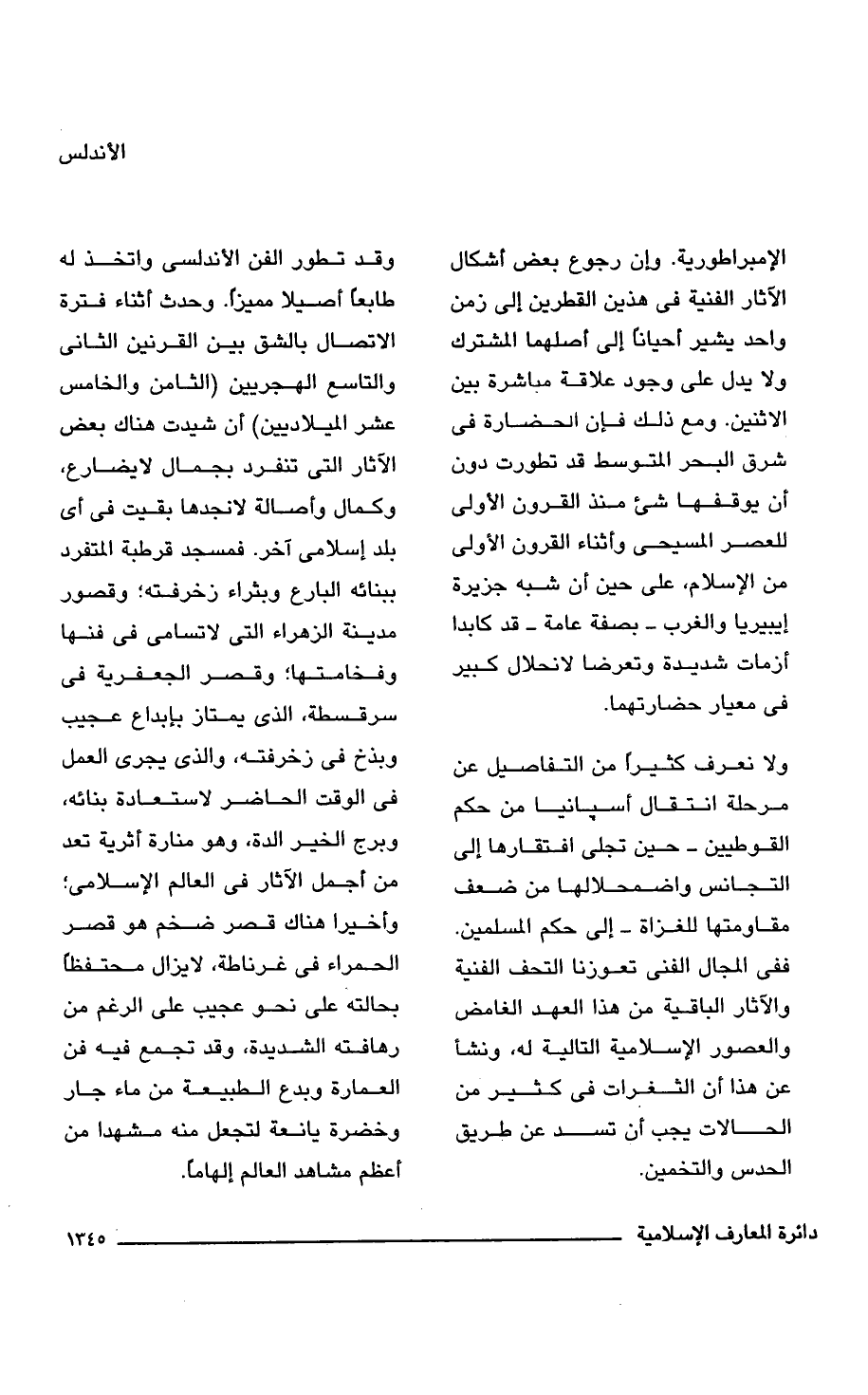 وقد تطور الفن الأندلسيّ واتخذ له طابعا أصيلا مميزًا. وحدث أثناء فترة الاتصال بالشق بين القرنين الثاني والتاسع الهجريين (الثامن والخامس عشر الميلاديين) أن شيدت هناك بعض الآثار التي تنفرد بجمال لا يضارع، وكمال وأصالة لا نجدها بقيت في أي بلد إسلامي آخر. فمسجد قرطبة المتفرد ببنائه البارع وبثراء زخرفته؛ وقصور مدينة الزهراء التي لا تسامى في فنها وفخامتها؛ وقصر الجعفرية في سرقسطة، الذي يمتاز بإبداع عجيب وبذخ في زخرفته، والذي يجري العمل في الوقت الحاضر لاستعادة بنائه، وبرج الخير الدة، وهو منارة أثرية تعد من أجمل الآثار في العالم الإسلامي؛ وأخيرا هناك قصر ضخم هو قصر الحمراء في غرناطة، لا يزال محتفظًا بحالته على نحو عجيب على الرغم من رهافته الشديدة، وقد تجمع فيه فن العمارة وبدع الطبيعة من ماء جار وخضرة يانعة لتجعل منه مشهدا من أعظم مشاهد العالم إلهامًا.