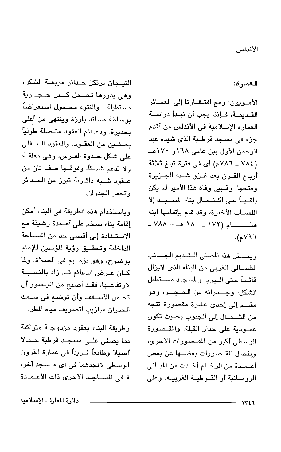 الأمويون: ومع افتقارنا إلى العمائر القديمة، فإننا يجب أن نبدأ دراسة العمارة الإِسلامية في الأندلس من أقدم جزء في مسجد قرطبة الذي شيده عبد الرحمن الأول بين عامي 168 و 170 هـ (784 - 786 م) أي في فترة تبلغ ثلاثة أرباع القرن بعد غزو شبه الجزيرة وفتحها. وقبيل وفاة هذا الأمير لم يكن باقيًا على اكتمال بناء المسجد إلا اللمسات الأخيرة، وقد قام بإتمامها ابنه هشام (172 - 180 هـ = 788 - 796 م).