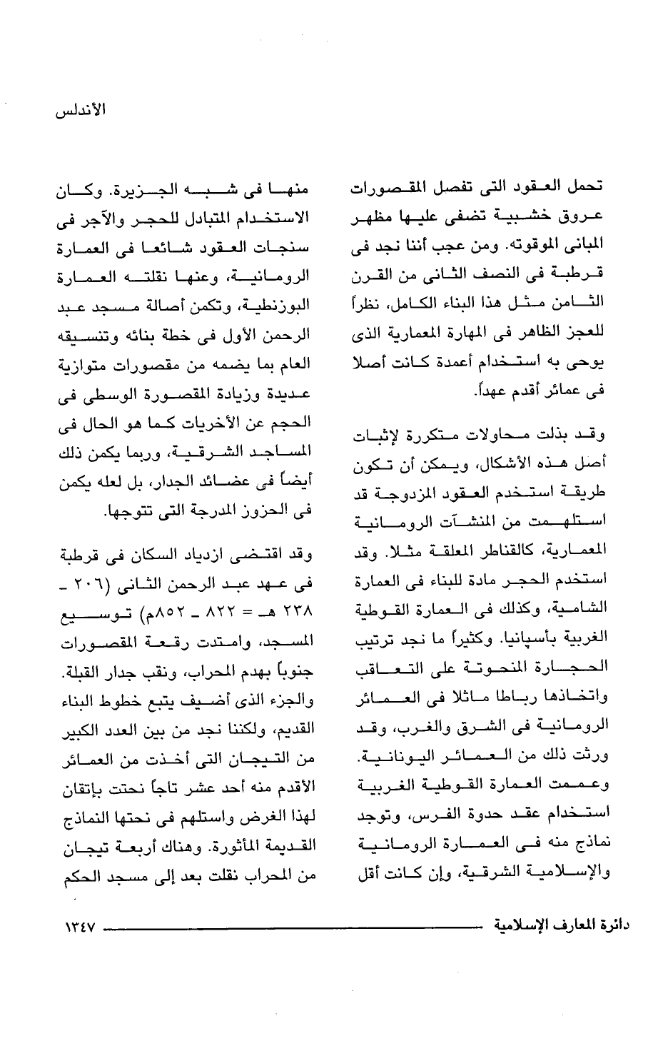 تحمل العقود التي تفصل المقصورات عروق خشبية تضفى عليها مظهر المباني الموقوته. ومن عجيب أننا نجد في قرطبة في النصف الثاني من القرن الثامن مثل هذا البناء الكامل، نظرًا للعجز الظاهر في المهارة المعمارية الذي يوحى به استخدام أعمدة كانت أصلًا في عمائر أقدم عهدًا.