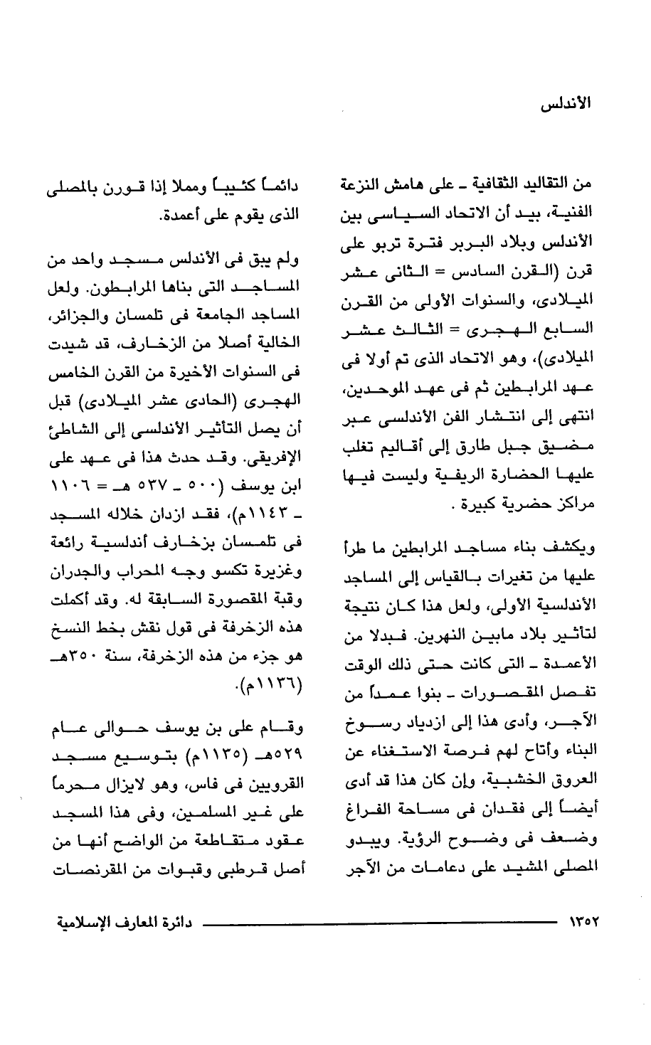 ويكشف بناء مساجد المرابطين ما طرأ عليها من تغيرات بالقياس إلى المساجد الأندلسية الأولى، ولعل هذا كان نتيجة لتأثير بلاد ما بين النهرين. فبدلا من الأعمدة -التي كانت حتى ذلك الوقت تفصل المقصورات- بنوا عمدًا من الآجر، وأدى هذا إلى ازدياد رسوخ البناء وأتاح لهم فرصة الاستغناء عن العروق الخشبية، وإن كان هذا قد أدى أيضًا إلى فقدان في مساحة الفراغ وضعف في وضوح الرؤية، ويبدو المصلى المشيد على دعامات من الآجر دائمًا كئيبًا ومملا إذا قورن بالمصلى الذي يقوم على أعمدة.
