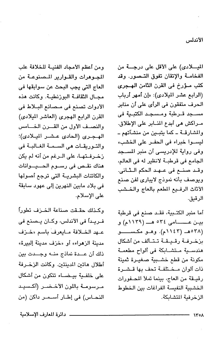 الميلادي) على الأقل على درجة من الفخامة والإتقان تفوق التصور. وقد كتب مؤرخ في القرن الثامن الهجري (الرابع عشر الميلادي): "إن أمهر أرباب الحرف متفقون في الرأى على أن منابر مسجد قرطبة ومسجد الكتبية في مراكش هي أبدع المنابر على الإطلاق. والمشارقة -كما يتبين من منشآتهم- ليسوا خبراء في الحفر على الخشب" وفي رواية للإدريسي أن منبر المسجد الجامع في قرطبة لا نظير له في العالم، وقد صنع في عهد الحكم الثاني. ويوصف بأنه نموذج لا يبارى لفن صنع الأثاث الرفيع المطعم بالعاج والخشب الرقيق.