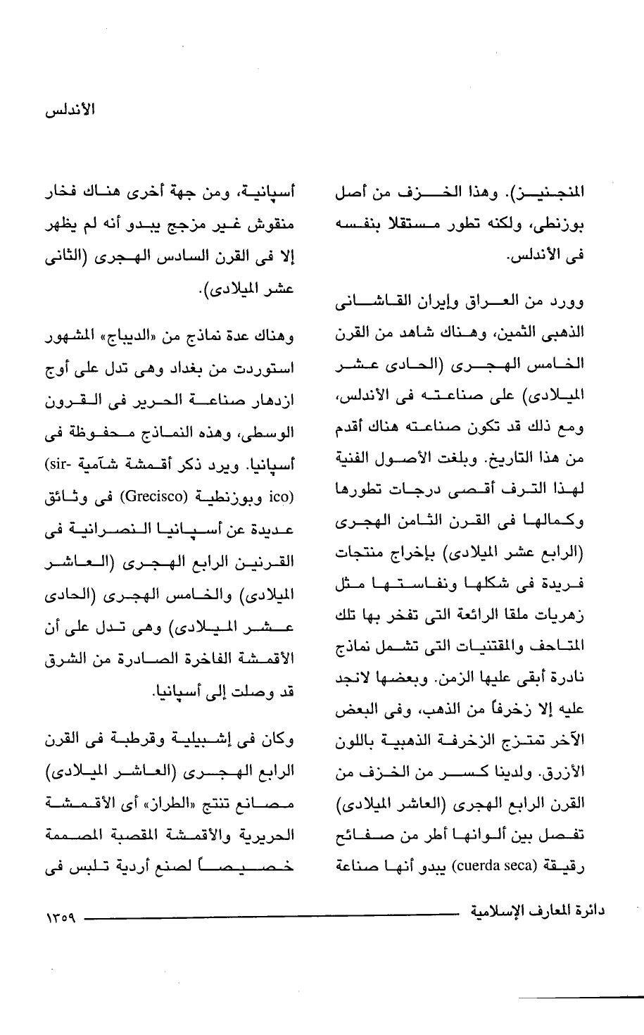 وهناك عدة نماذج من "الديباج" المشهور استوردت من بغداد وهي تدل على أوج ازدهار صناعة الحرير في القرون الوسطى، وهذه النمادج محفوظة في أسبانيا. ويرد ذكر أقمشة شآمية - sir) ico) وبوزنطية (Grecisco) في وثائق عديدة عن أسبانيا النصرانية في القرنين الرابع الهجري (العاشر الميلادي) والخامس الهجري (الحادي عشر الميلادي) وهي تدل على أن الأقمشة الفاخرة الصادرة من الشرق قد وصلت إلى أسبانيا.