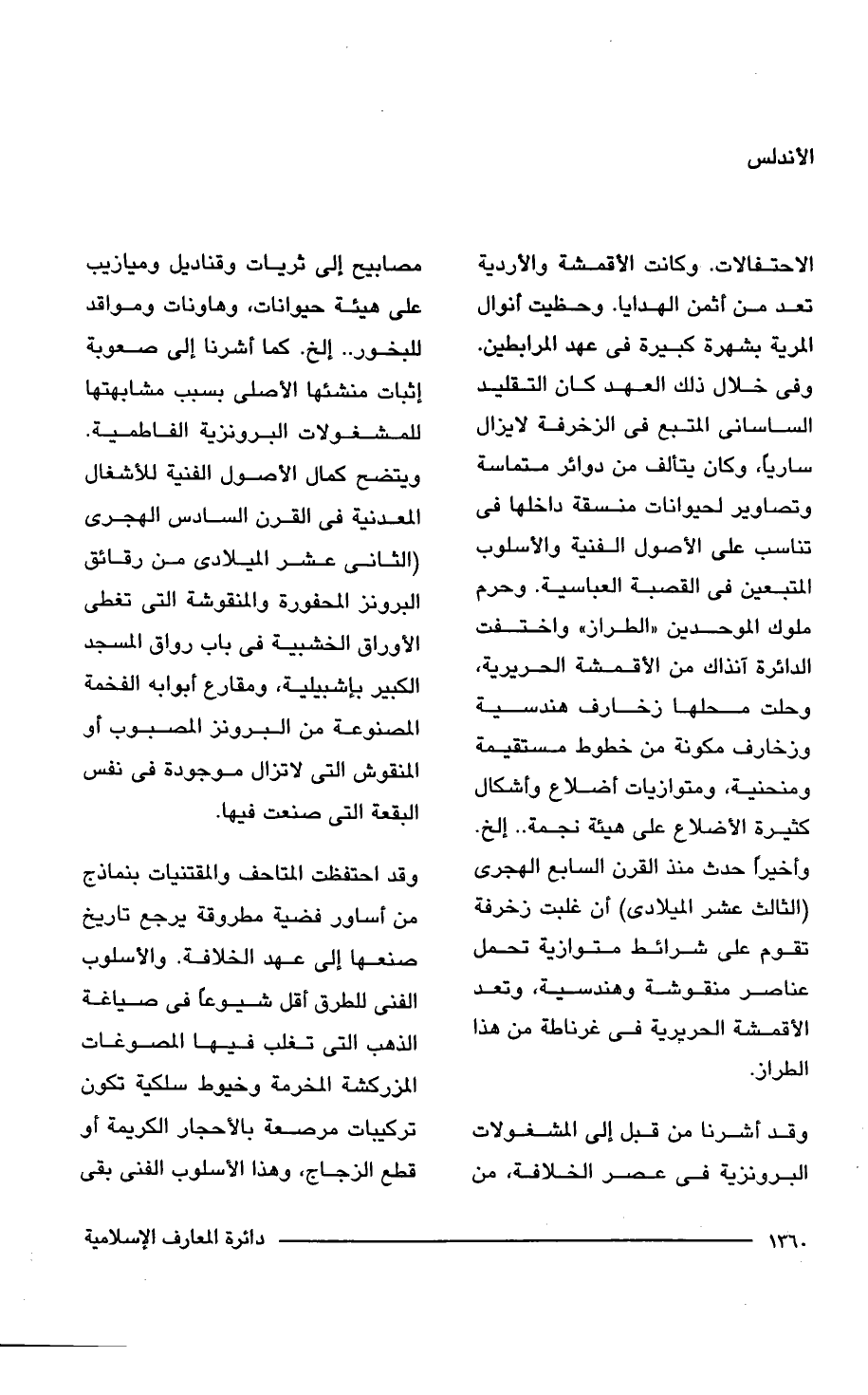 الاحتفالات. وكانت الأقمشة والأردية تعد من أثمن الهدايا. وحظيت أنوال المرية بشهرة كبيرة في عهد المرابطين. وفي خلال ذلك العهد كان التقليد الساساني المتبع في الزخرفة لا يزال ساريا، وكان يتألف من دوائر متماسة وتصاوير لحيوانات منسقة داخلها في تناسب على الأصول الفنية والأسلوب المتبعين في القصبة العباسية. وحرم ملوك الموحدين "الطراز" واختفت الدائرة آنذاك من الأقمشة الحريرية، وحلت محلها زخارف هندسية وزخارف مكونة من خطوط مستقيمة ومنحنية، ومتوازيات أضلاع وأشكال كثيرة الأضلاع على هيئة نجمة .. إلخ. وأخيرًا حدث منذ القرن السابع الهجري (الثالث عشر الميلادي) أن غلبت زخرفة تقوم على شرائط متوازية تحمل عناصر منقوشة وهندسية، وتعد الأقمشة الحريرية في غرناطة من هذا الطراز.