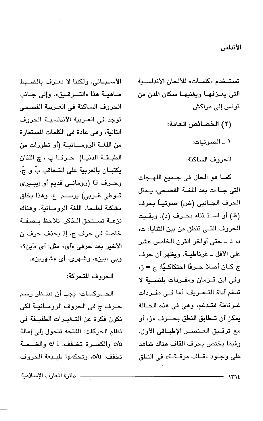 كما هو الحال في جميع اللهجات التي جاءت بعد اللغة الفصحى، يمثل الحرف الجانبي (ض) صوتيا بحرف (ظ) أو استثناء بحرف (د). وبقيت الحروف التي تنطق من بين الثنايا: ت، د، ذ -حتى أواخر القرن الخامس عشر على الأقل -غرناطية. ويظهر أن حرف ج كان أصلًا حرفا احتكاكيًا: ج = ز، وفي ابن قزمان ومفردات بلنسية لا تدغم أداة التعريف، أما في مفردات غرناطة فتدغم، وهي في هذه الحالة يمكن أن تطابق النطق بحرف "ز" أو مع ترقيق العنصر الإطباقي الأول. وفيما يختص بحرف القاف هناك شاهد على وجود "قاف مرققة" في النطق الأسباني، ولكننا لا نعرف بالضبط ماهية هذا "الترقيق". وإلى جانب الحروف الساكنة في العربية الفصحى توجد في العربية الأندلسية الحروف التالية، وهي عادة في الكلمات المستعارة من اللغة الرومانية (أو تطورات من الطبقة الدنيا): حرفا ب، ج اللذان يكتبان بالعربية على التعاقب ب وجّ، وحرف G (روماني قديم أو إيبيري قوطي غربي) يرسم: غ، وهذا يخلق مشكلة لعلماء اللغة الرومانية. وهناك نزعة تستحق الذكر، تلاحظ بصفة خاصة في حرف ج، إذ يحذف حرف ن الأخير بعد حرفي "أي" مثل: أي "أين؟ " وبي " بين"، وشهرى, أي "شهرين".