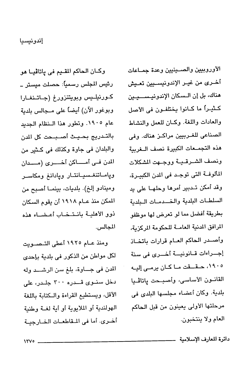الأوربيين والصينيين وعدة جماعات أخرى من غير الإندونيسيين تعيش هناك، بل إن السكان الإندونيسيين كثيرًا ما كانوا يختلفون في الأصل والعادات واللغة. وكان للعمل والنشاط الصناعي للغربيين مراكز هناك. وفي هذه التجمعات الكبيرة نصف الغربية ونصف الشرقية ووجهت المشكلات المألوفة التي توجد في المدن الكبيرة، وقد أمكن تدبير أمرها وحلها على يد السلطات البلدية والخدمات البلدية بطريقة أفضل مما لو تعرض لها موظفو المرافق المدنية العامة للحكومة المركزية، وأصدر الحاكم العام قرارات باتخاذ إجراءات قانونية أخرى في سنة 1905، حققت ما كان يرمي إليه القانون الأساسي، وأصبحت باتافيا بلدية. وكان أعضاء مجلسها البلدي في مرحلتها الأولى يعينون من قبل الحاكم العام ولا ينتخبون.