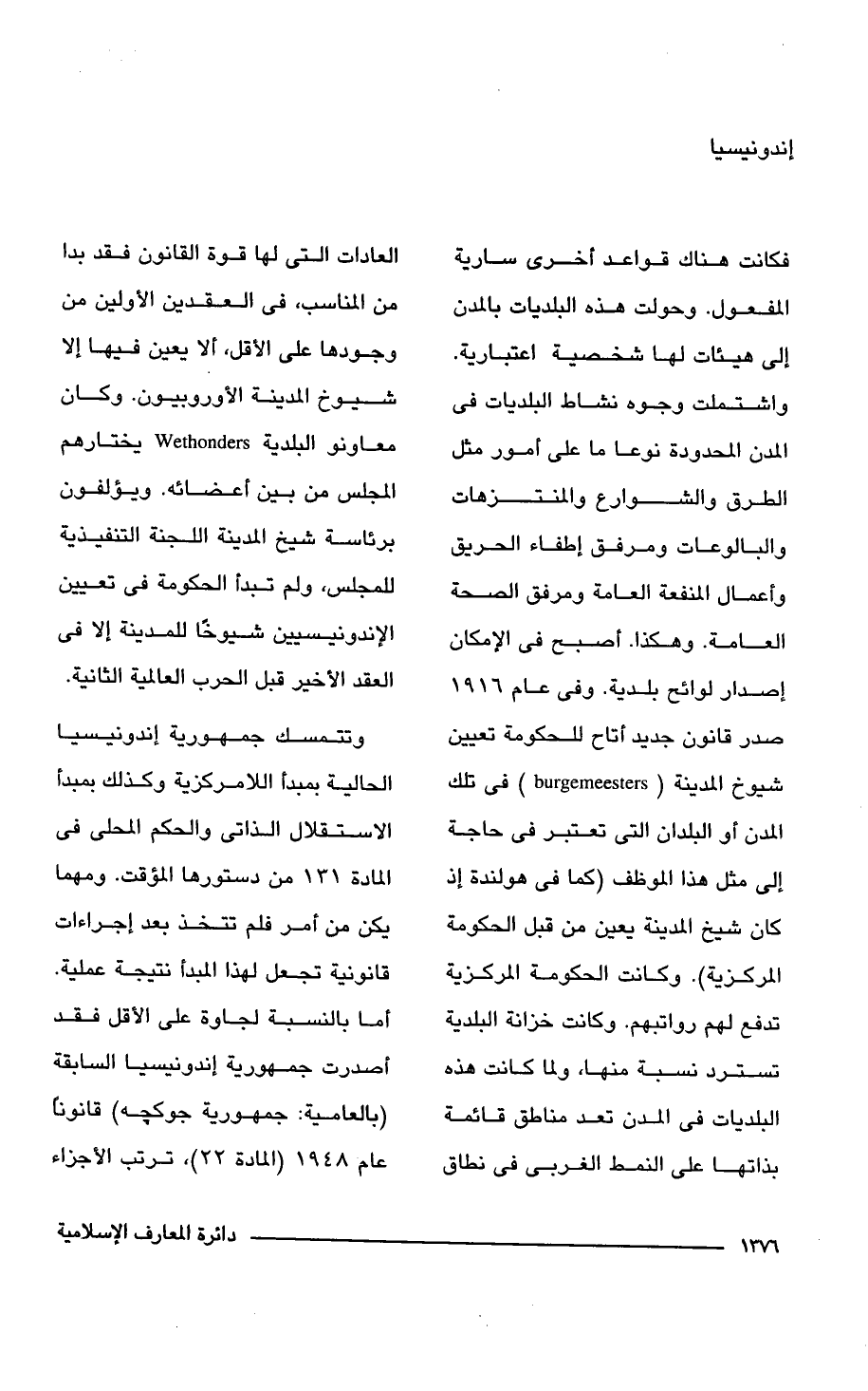 فكانت هناك قواعد أخرى سارية المفعول. وحولت هذه البلديات بالمدن إلى هيئات لها شخصية اعتبارية. واشتملت وجوه نشاط البلديات في المدن المحدودة نوعا ما على أمور مثل الطرق والشوارع والمنتزهات والبالوعات ومرفق إطفاء الحريق وأعمال المنفعة العامة ومرفق الصحة العامة. وهكذا. أصبح في الإمكان إصدار لوائح بلدية. وفي عام 1916 صدر قانون جديد أتاح للحكومة تعيين شيوخ المدينة (burgemeesters) في تلك المدن أو البلدان التي تعتبر في حاجة إلى مثل هذا الموظف (كما في هولندة إذ كان شيخ المدينة يعين من قبل الحكومة المركزية). وكانت الحكومة المركزية تدفع لهم رواتبهم. وكانت خزانة البلدية تسترد نسبة منها, ولما كانت هذه البلديات في المدن تعد مناطق قائمة بذاتها على النمط الغربيّ في نطاق العادات التي لها قوة القانون فقد بدا من المناسب، في العقدين الأولين من وجودها على الأقل، ألا يعين فيها إلا شيوخ المدينة الأوربيون. وكان معاونو البلدية Wethonders يختارهم المجلس من بين أعضائه. ويؤلفون برئاسة شيخ المدينة اللجنة التنفيذية للمجلس، ولم تبدأ الحكومة في تعيين الإندونيسيين شيوخًا للمدينة إلا في العقد الأخير قبل الحرب العالمية الثانية.