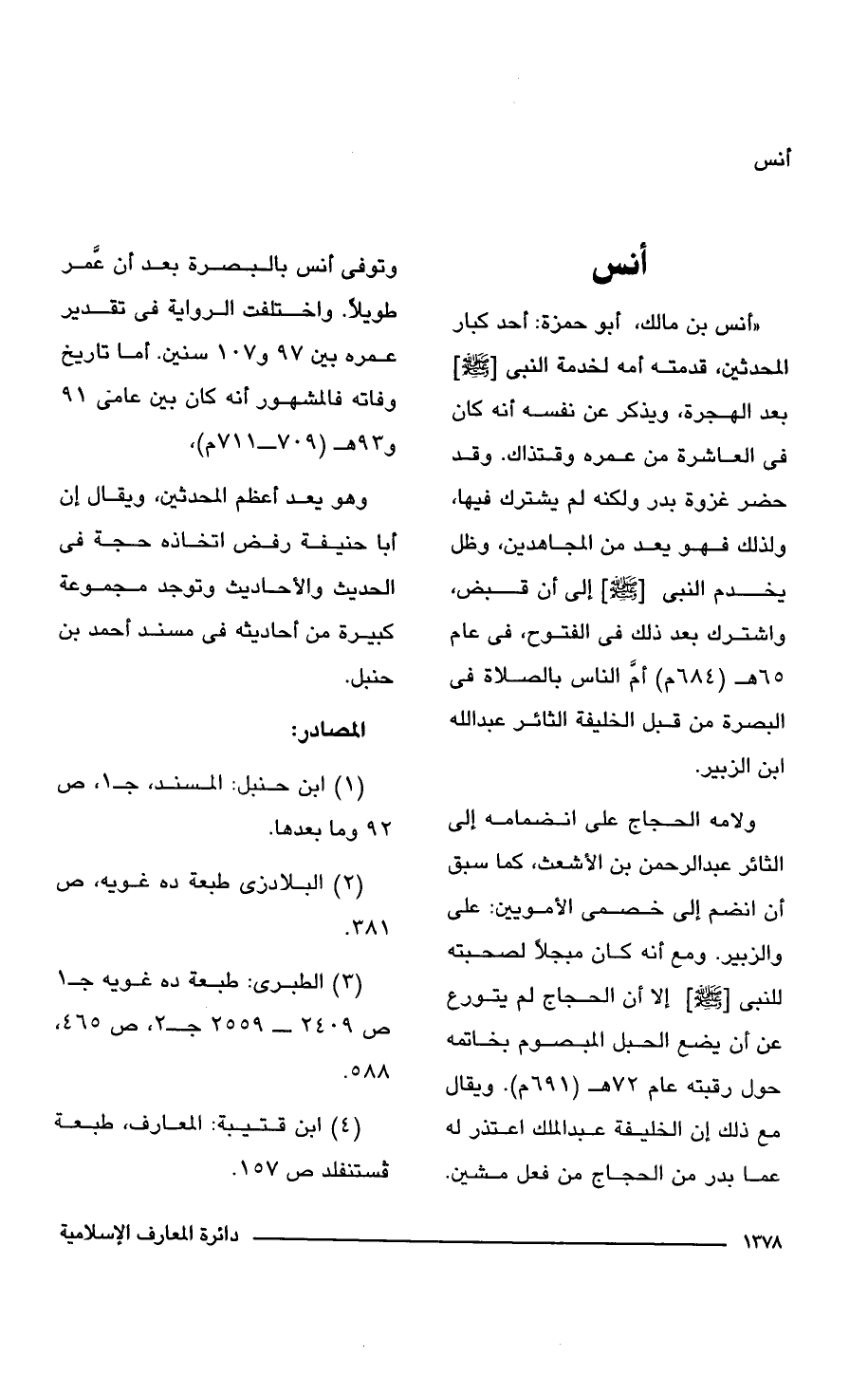 " أنس بن مالك، أبو حمزة: أحد كبار المحدثين، قدمته أمه لخدمة النبي [- صلى الله عليه وسلم -] بعد الهجرة، ويذكر عن نفسه أنه كان في العاشرة من عمره وقتذاك. وقد حضر غزوة بدر ولكنه لم يشترك فيها، ولذلك فهو يعد من المجاهدين، وظل يخدم النبي [- صلى الله عليه وسلم -] إلى أن قبض، واشترك بعد ذلك في الفتوح، في عام 65 هـ (684 م) أمَّ الناس بالصلاة في البصرة من قبل الخليفة الثائر عبد الله بن الزبير.