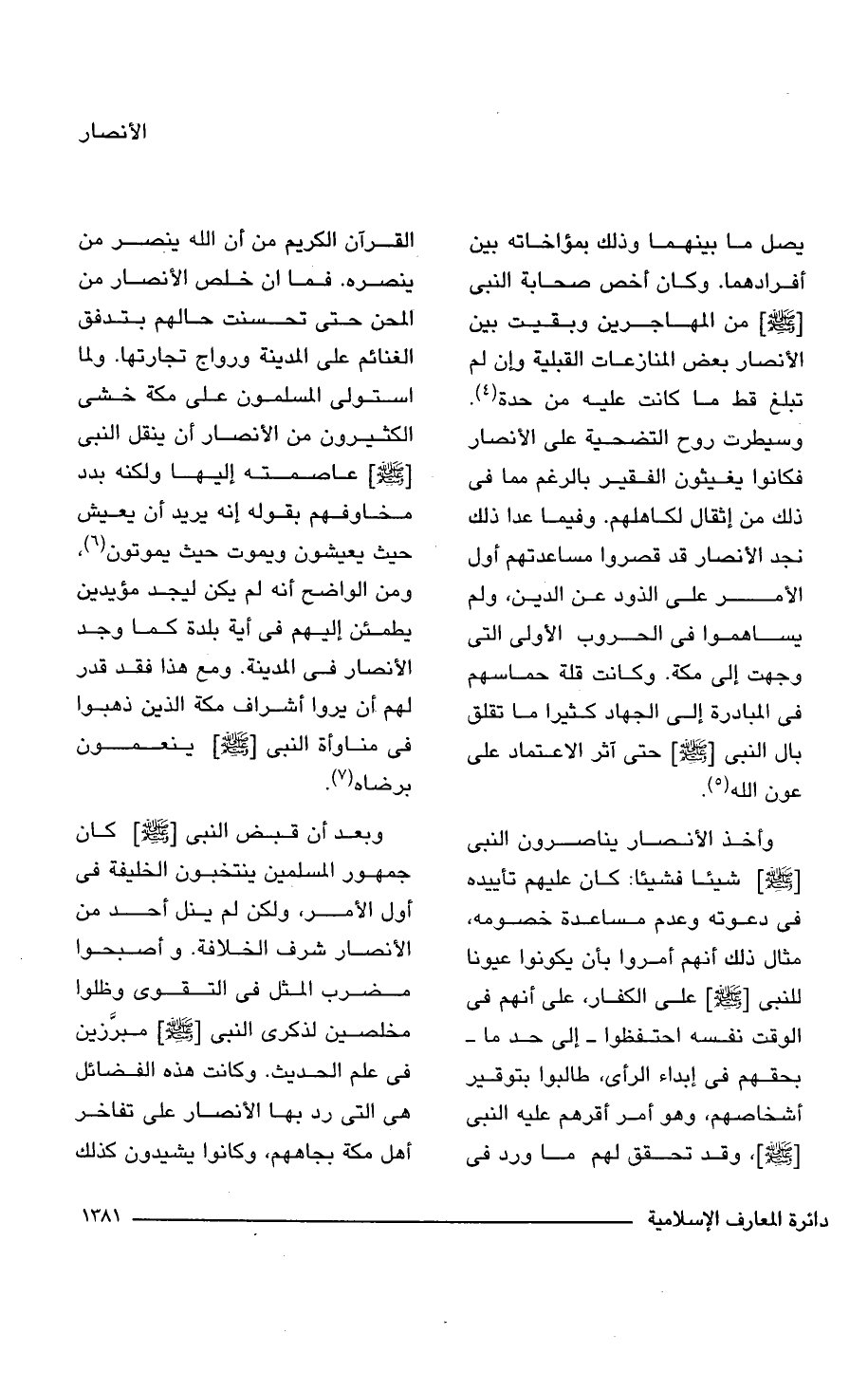 يصل ما بينهما وذلك بمؤاخاته بين أفرادهما. وكان أخص صحابة النبي [- صلى الله عليه وسلم -] من المهاجرين وبقيت بين الأنصار بعض المنازعات القبلية وإن لم تبلغ قط ما كانت عليه من حدة (4). وسيطرت روح التضحية على الأنصار فكانوا يغيثون الفقير بالرغم مما في ذلك من إثقال لكاهلهم. وفيما عدا ذلك نجد الأنصار قد قصروا مساعدتهم أول الأمر على الذود عن الدين، ولم يساهموا في الحروب الأولى التي وجهت إلى مكة. وكانت قلة حماسهم في المبادرة إلى الجهاد كثيرا ما تقلق بال النبي [- صلى الله عليه وسلم -] حتى آثر الاعتماد على عون الله (5).