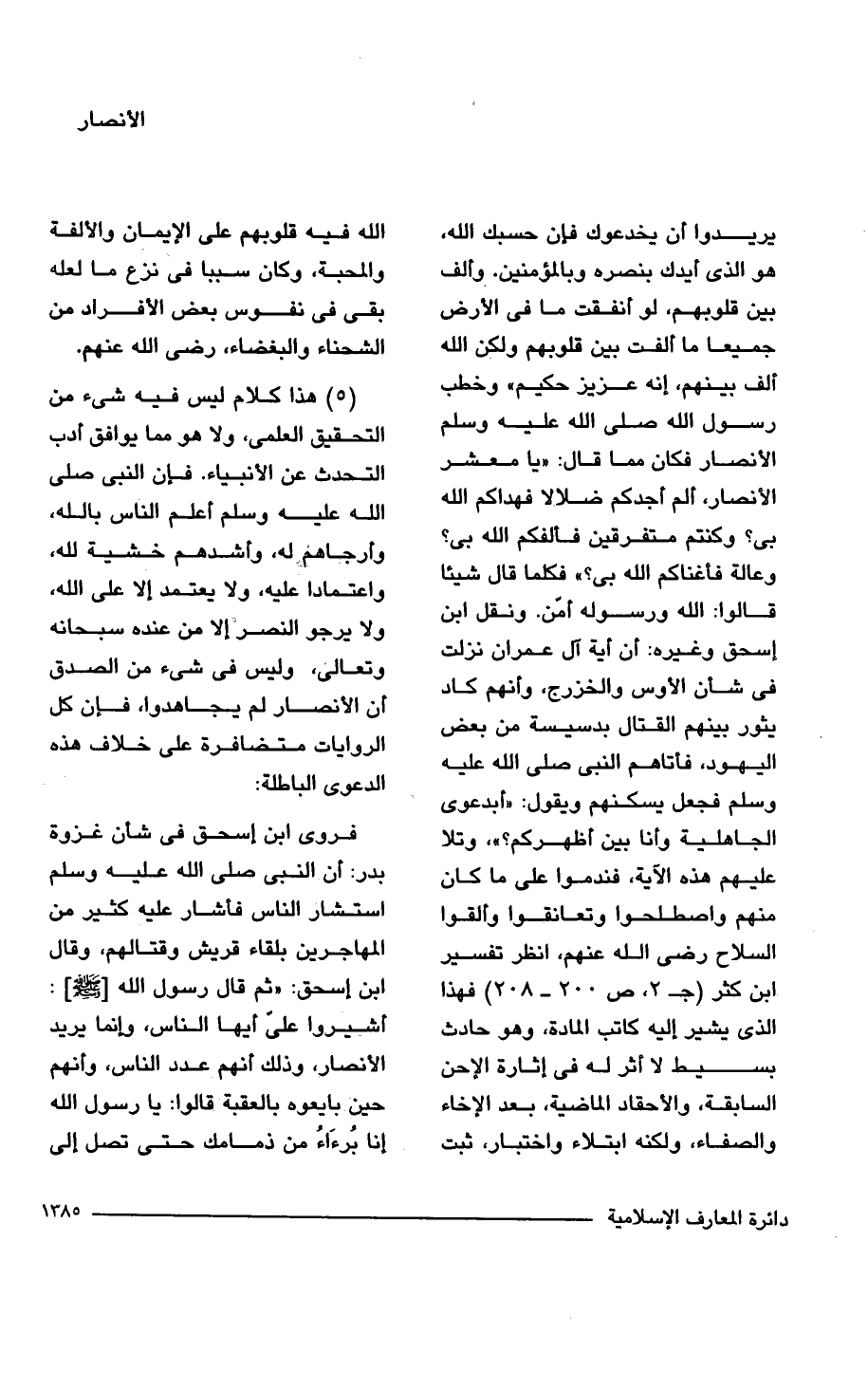 يُرِيدُوا أَنْ يَخْدَعُوكَ فَإِنَّ حَسْبَكَ اللَّهُ هُوَ الَّذِي أَيَّدَكَ بِنَصْرِهِ وَبِالْمُؤْمِنِينَ (62) وَأَلَّفَ بَيْنَ قُلُوبِهِمْ لَوْ أَنْفَقْتَ مَا فِي الْأَرْضِ جَمِيعًا مَا أَلَّفْتَ بَيْنَ قُلُوبِهِمْ وَلَكِنَّ اللَّهَ أَلَّفَ بَيْنَهُمْ إِنَّهُ عَزِيزٌ حَكِيمٌ} وخطب رسول الله صلى الله عليه وسلم الأنصار فكان مما قال: "يا معشر الأنصار، ألم أجدكم ضلالا فهداكم الله بي؟ وكنتم متفرقين فألفكم الله بي؟ وعالة فأغناكم الله بي؟ " فكلما قال شيئًا قالوا: الله ورسوله أمّن. ونقل ابن إسحاق وغيره: أن آية آل عمران نزلت في شأن الأوس والخزرج، وأنهم كاد يثور بينهم القتال بدسيسة من بعض اليهود، فأتاهم النبي صلى الله عليه وسلم فجعل يسكنهم ويقول: "أبدعوى الجاهلية وأنا بين أظهركم؟ "، وتلا عليهم هذه الآية، فندموا على ما كان منهم واصطلحوا وتعانقوا وألقوا السلاح رضي الله عنهم، انظر تفسير ابن كثير (جـ 2، ص 200 - 208) فهذا الذي يشير إليه كاتب المادة، وهو حادث بسيط لا أثر له في إثارة الإحن السابقة، والأحقاد الماضية، بعد الإخاء والصفاء، ولكنه ابتلاء واختبار، ثبت الله فيه قلوبهم على الإيمان والألفة والمحبة، وكان سببا في نزع ما لعله بقى في نفوس بعض الأفراد من الشحناء والبغضاء، رضي الله عنهم.