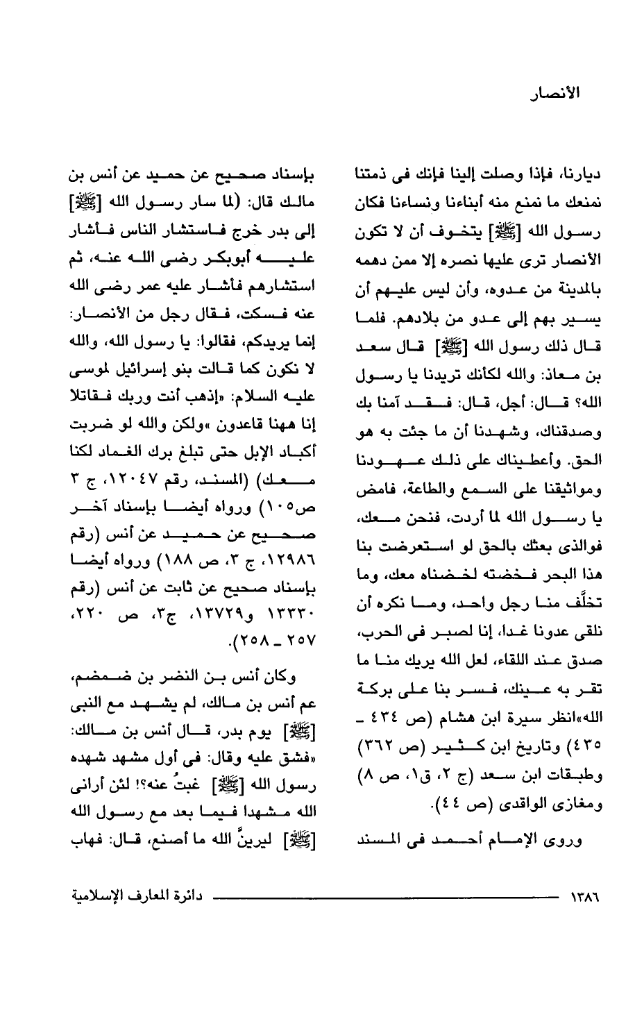 وروى الإِمام أحمد في المسند بإسناد صحيح عن حميد عن أنس بن مالك قال: (لما سار رسول الله [- صلى الله عليه وسلم -] إلى بدر خرج فاستشار الناس فأشار عليه أبو بكر رضي الله عنه، ثم استشارهم فأشار عليه عمر رضي الله عنه فسكت، فقال رجل من الأنصار: إنما يريدكم، فقالوا: يا رسول الله، والله لا نكون كما قالت بنو إسرائيل لموسى - عليه السلام -: "اذهب أنت وربك فقاتلا إنا ها هنا قاعدون" ولكن والله لو ضربت أكباد الإبل حتى تبلغ برك الغماد لكنا معك) (المسند، رقم 12047, ج 3 ص 105) ورواه أيضًا بإسناد آخر صحيح عن حميد عن أنس (رقم 12986, ج 3، ص 188) ورواه أيضًا بإسناد صحيح عن ثابت عن أنس (رقم 13330 و 13729، ج 3، ص 220، 257 - 258).