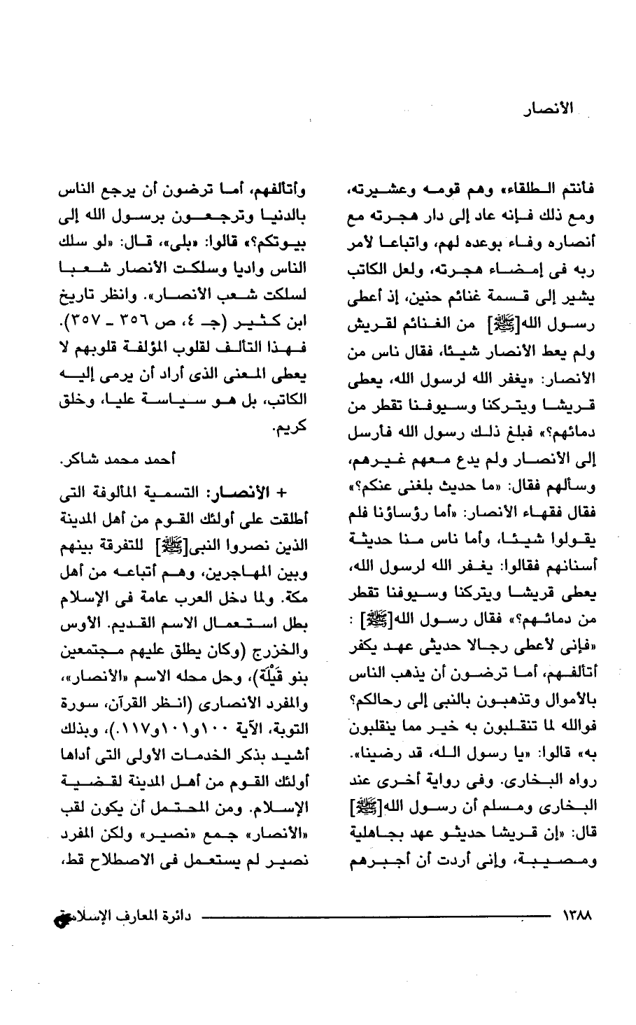 + الأنصار: التسمية المألوفة التي أطلقت على أولئك القوم من أهل المدينة الذين نصروا النبي [- صلى الله عليه وسلم -] للتفرقة بينهم وبين المهاجرين، وهم أتباعه من أهل مكة. ولما دخل العرب عامة في الإِسلام بطل استعمال الاسم القديم. الأوس والخزرج (وكان يطلق عليهم مجتمعين بنو قَيلَة)، وحل محله الاسم "الأنصار"، والمفرد الأنصاري (انظر القرآن، سورة التوبة، الآية 100 و 101 و 117.)، وبذلك أشيد بذكر الخدمات الأولى التي أداها أولئك القوم من أهل المدينة لقضية الإِسلام. ومن المحتمل أن يكون لقب "الأنصار" جمع "نصير" ولكن المفرد نصير لم يستعمل في الاصطلاح قط،