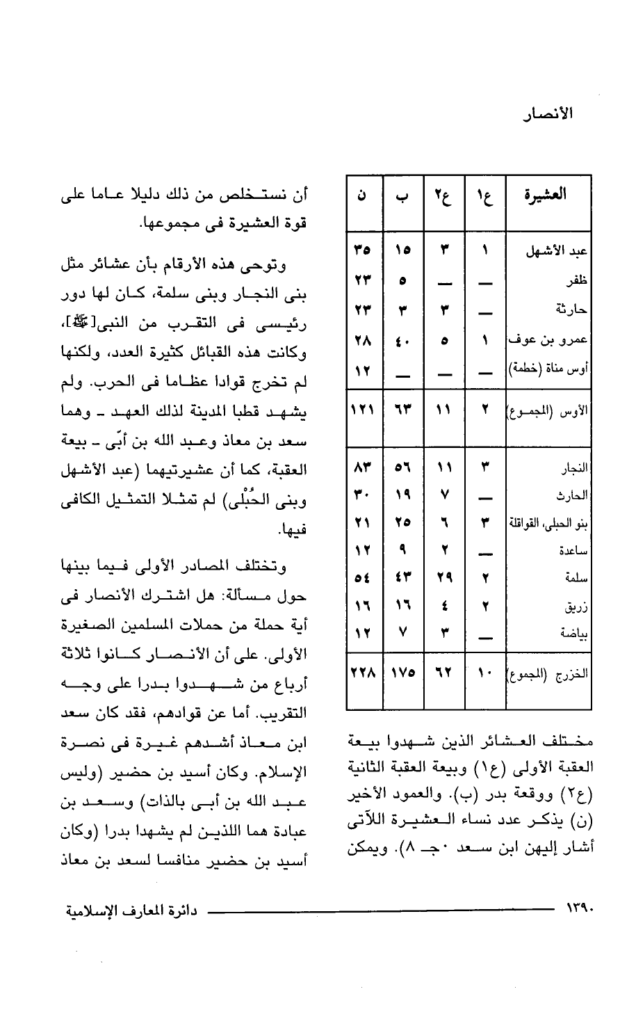 مختلف العشائر الذين شهدوا بيعة العقبة الأولى (ع 1) وبيعة العقبة الثانية (ع 2) ووقعة بدر (ب). والعمود الأخير (ن) يذكر عدد نساء العشيرة اللآتي أشار إليهن ابن سعد جـ 8). ويمكن أن نستخلص من ذلك دليلًا عاما على قوة العشيرة في مجموعها.