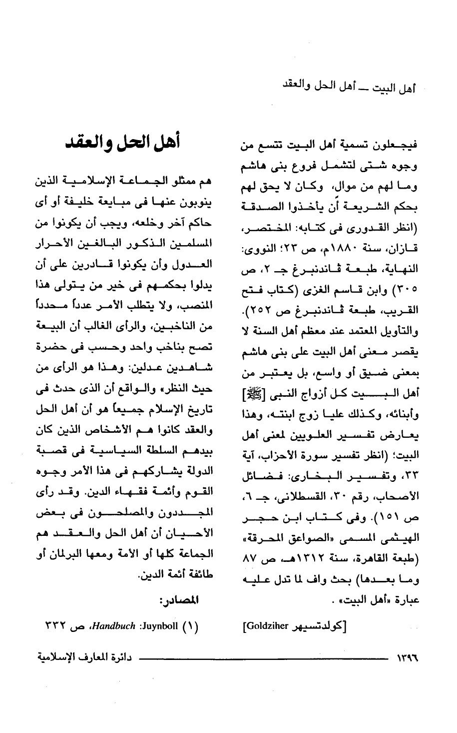 هم ممثلو الجماعة الإِسلامية الذين ينوبون عنها في مبايعة خليفة أو أي حاكم آخر وخلعه، ويجب أن يكونوا من المسلمين الذكور البالغين الأحرار العدول وأن يكونوا قادرين على أن يدلوا بحكمهم في خير من يتولى هذا المنصب، ولا يتطلب الأمر عددا محددا من الناخبين، والرأى الغالب أن البيعة تصح بناخب واحد وحسب في حضرة شاهدين عدلين: وهذا هو الرأى من حيث النظر" والواقع أن الذي حدث في تاريخ الإِسلام جميعًا هو أن أهل الحل والعقد كانوا هم الأشخاص الذين كان بيدهم السلطة السياسية في قصبة الدولة يشاركهم في هذا الأمر وجوه القوم وأئمة فقهاء الدين. وقد رأى المجددون والمصلحون في بعض الأحيان أن أهل الحل والعقد هم الجماعة كلها أو الأمة ومعها البرلمان أو طائفة أئمة الدين.