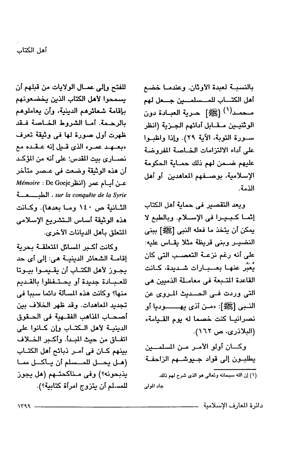 بالنسبة لعبدة الأوثان. وعندما خضع أهل الكتاب للمسلمين جعل لهم محمَّد (1) [- صلى الله عليه وسلم -] حرية العبادة دون الوثنيين مقابل أدائهم الجزية (انظر سورة التوبة، الآية 29). وإذا واظبوا على أداء الالتزامات الخاصة المفروضة عليهم ضمن لهم ذلك حماية الحكومة الإِسلامية، بوصفهم المعاهدين أو أهل الذمة.