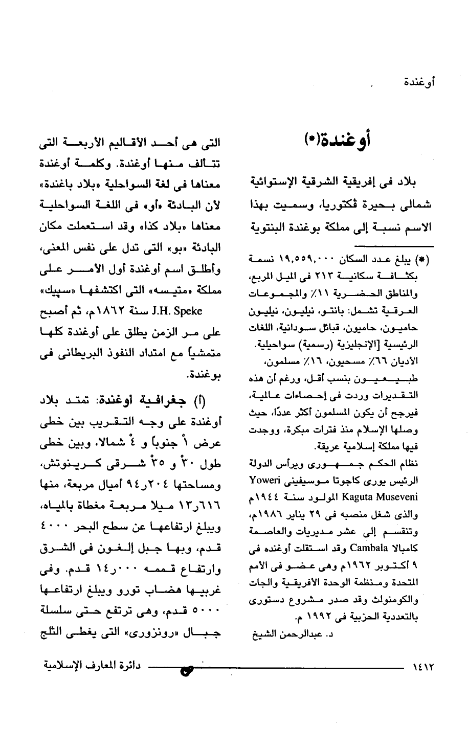 (أ) جغرافية أوغندة: تمتد بلاد أوغندة على وجه التقريب بين خطى عرض 1 ْ جنوبا و 4 ْ شمالا، وبين خطى طول 30 ْ و 35 ْ شرقي كرينوتش، ومساحتها 204 ر 94 أميال مربعة، منها 13.616 ميلا مربعة مغطاة بالمياه، ويبلغ ارتفاعها عن سطح البحر 4000 قدم، وبها جبل إلغون في الشرق وارتفاع قممه 14.000 قدم. وفي غربيها هضاب تورو ويبلغ ارتفاعها 5000 قدم، وهي ترتفع حتى سلسلة جبال "رونزورى" التي يغطى الثلج